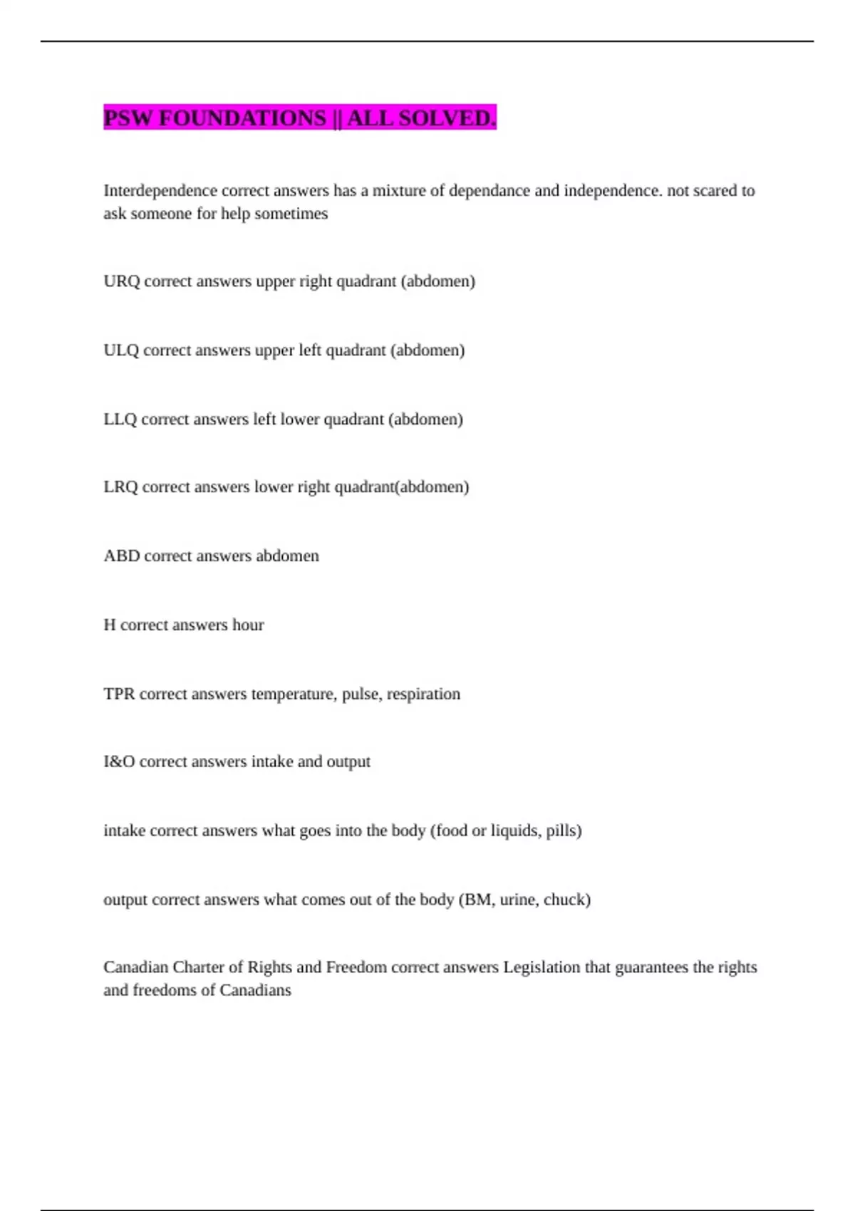 Interdependence correct answers has a mixture of dependance and independence. not scared to ask someone for help sometimes URQ correct answers upper right quadrant (abdomen) ULQ correct answers upper left quadrant (abdomen) LLQ correct answers left lower quadrant (abdomen) LRQ correct answers lower right quadrant(abdomen) ABD correct answers abdomen H correct answers hour TPR correct answers temperature, pulse, respiration I&O correct answers intake and output intake correct answers what goes into the body (food or liquids, pills) output correct answers what comes out of the body (BM, urine, chuck) Canadian Charter of Rights and Freedom correct answers Legislation that guarantees the rights and freedoms of Canadians