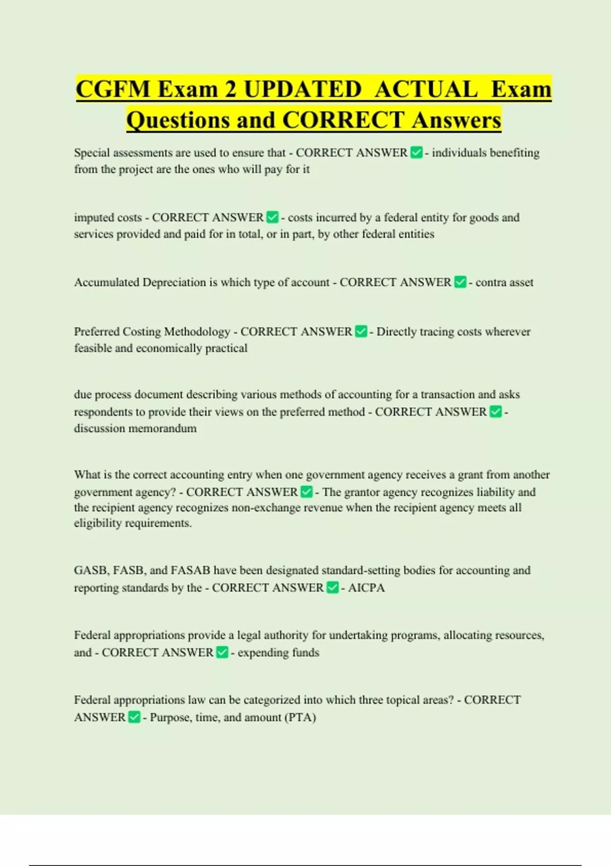 CGFM Exam 2 UPDATED ACTUAL Exam Questions and CORRECT Answers Special assessments are used to ensure that - CORRECT ANSWER - individuals benefiting from the project are the ones who will pay for it imputed costs - CORRECT ANSWER - costs incurred by a federal entity for goods and services provided and paid for in total, or in part, by other federal entities Accumulated Depreciation is which type of account - CORRECT ANSWER - contra asset Preferred Costing Methodology - CORRECT ANSWER - Directly tracing costs wherever feasible and economically practic