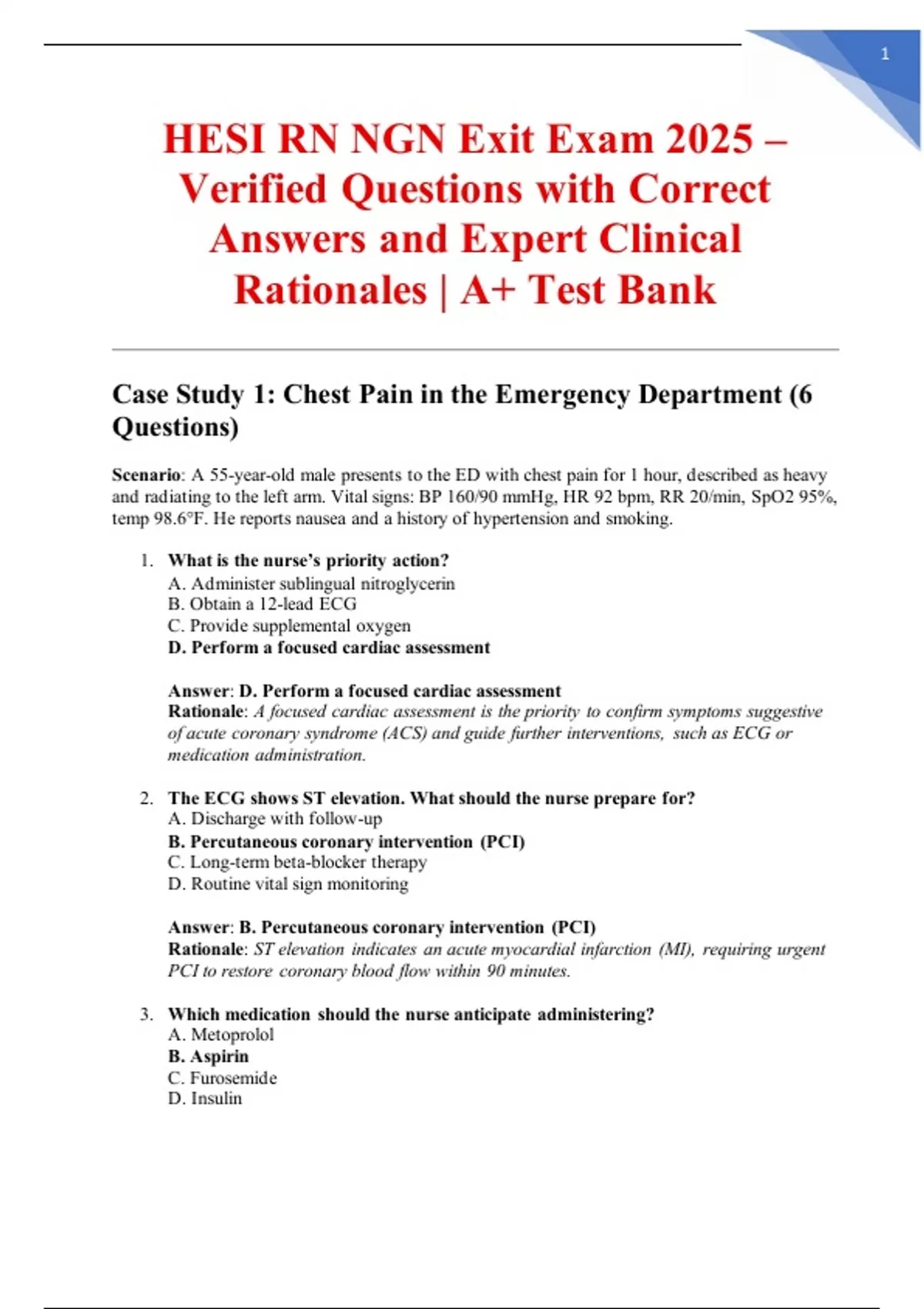 Scenario: A 55-year-old male presents to the ED with chest pain for 1 hour, described as heavy