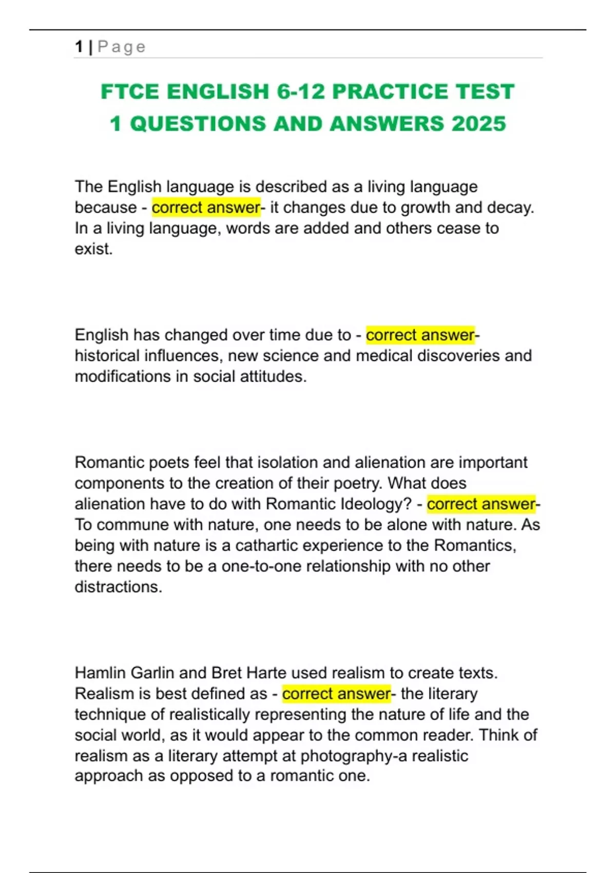 FTCE ENGLISH 6-12 PRACTICE TEST 1 QUESTIONS AND ANSWERS 2025