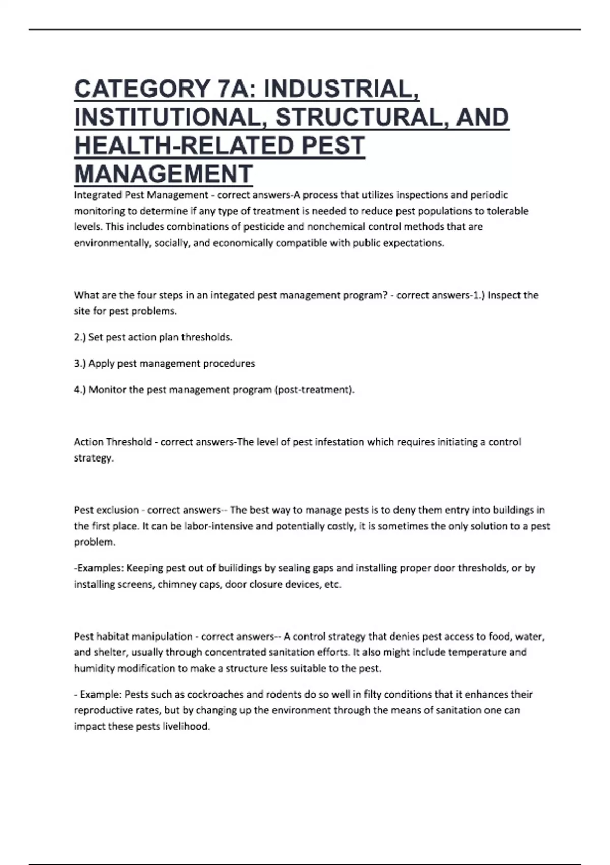 CATEGORY 7A: INDUSTRIAL, INSTITUTIONAL, STRUCTURAL, AND HEALTH-RELATED PEST MANAGEMENT Integrated Pest Management - correct answers-A process that utilizes inspections and periodic monitoring to determine if any type of treatment is needed to reduce pest populations to tolerable levels. This includes combinations of pesticide and nonchemical control methods that are environmentally, socially, and economically compatible with public expectations. What are the four steps in an integated pest management program? - correct answers-1.) Inspect the site for pest problems. 2.) Set pest action plan thresholds. 3.) Apply pest management procedures 4.) Monitor the pest management program (post-treatment). Action Threshold - correct answers-The level of pest infestation which requires initiating a control strategy. Pest exclusion - correct answers-- The best way to manage pests is to deny them entry into buildings in the first place. It can be labor-intensive and potentially costly, it is sometimes the only solution to a pest problem. -Examples: Keeping pest out of builidings by sealing gaps and installing proper door thresholds, or by installing screens, chimney caps, door closure devices, etc. Pest habitat manipulation - correct answers-- A control strategy that denies pest access to food, water, and shelter, usually through concentrated sanitation efforts. It also might include temperature and humidity modification to make a structure less suitable to the pest. - Example: Pests such as cockroaches and rodents do so well in filty conditions that it enhances their reproductive rates, but by changing up the environment through the means of sanitation one can impact these pests livelihood.