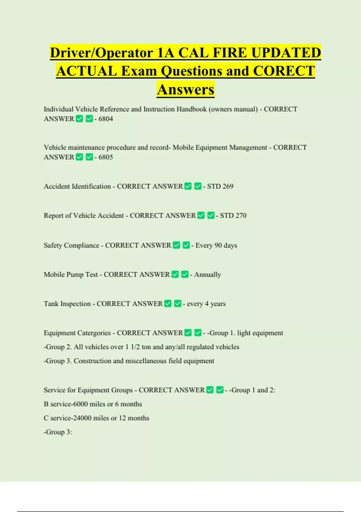 Driver/Operator 1A CAL FIRE UPDATED ACTUAL Exam Questions and CORECT Answers Individual Vehicle Reference and Instruction Handbook (owners manual) - CORRECT ANSWER - 6804 Vehicle maintenance procedure and record- Mobile Equipment Management - CORRECT ANSWER - 6805 Accident Identification - CORRECT ANSWER Report of Vehicle Accident - CORRECT ANSWER Safety Compliance - CORRECT ANSWER - STD 269 - STD 2