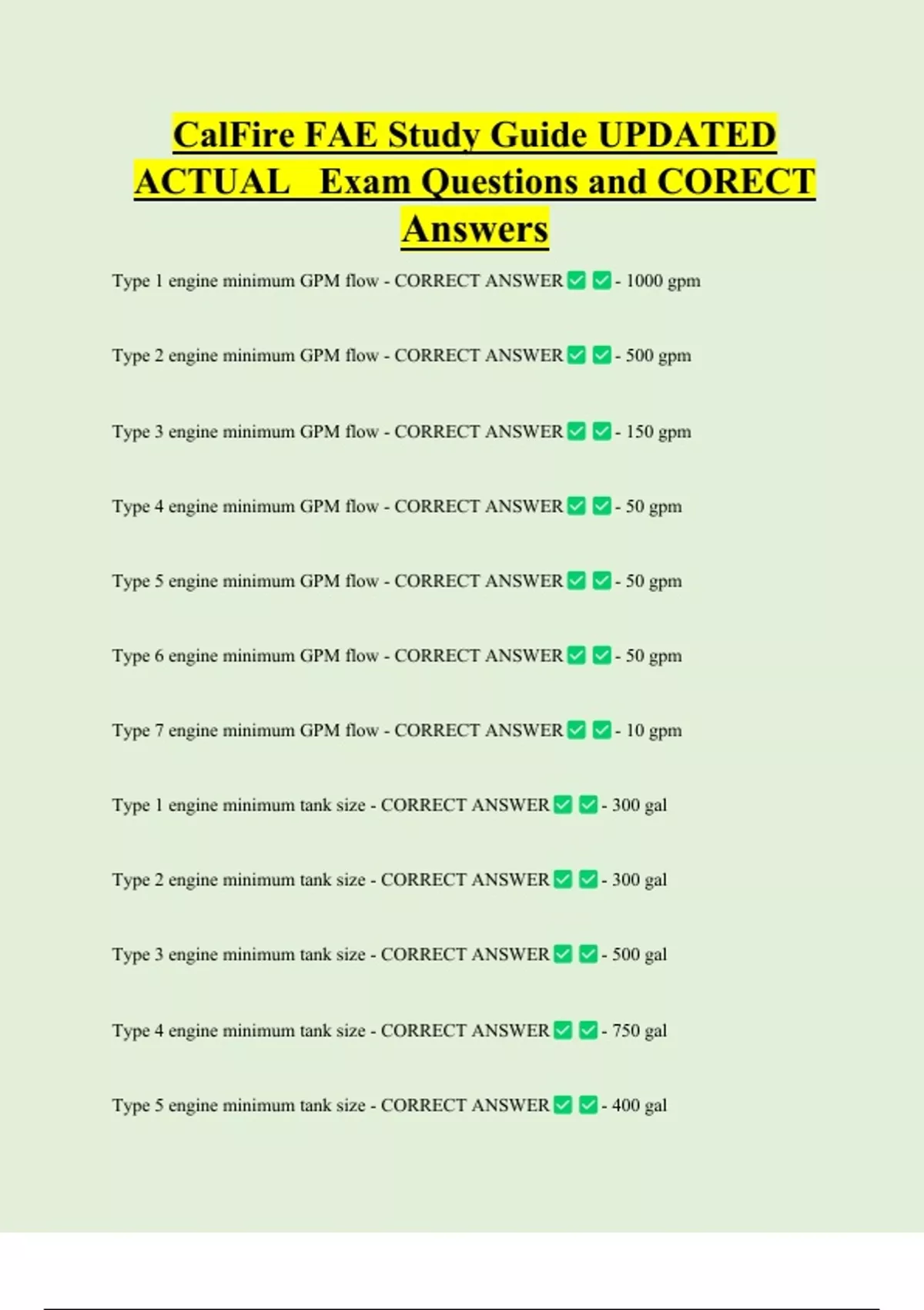 CalFire FAE Study Guide UPDATED ACTUAL Exam Questions and CORECT Answers Type 1 engine minimum GPM flow - CORRECT ANSWER Type 2 engine minimum GPM flow - CORRECT ANSWER Type 3 engine minimum GPM flow - CORRECT ANSWER Type 4 engine minimum GPM flow - CORRECT ANSWER Type 5 engine minimum GPM flow - CORRECT ANSWER Type 6 engine minimum GPM flow - CORRECT ANSWER Type 7 engine minimum GPM flow - CORRECT ANSWER Type 1 engine minimum tank size - CORRECT ANSWER Type 2 engine minimum tank size - CORRECT ANSWER Type 3 engine minimum tank size - CORRECT ANSWER Type 4 engine minimum tank size - CORRECT ANSWER Type 5 engine minimum tank size - CORRECT ANSWER - 1000 gpm - 500 gpm - 150 gpm - 50 gpm