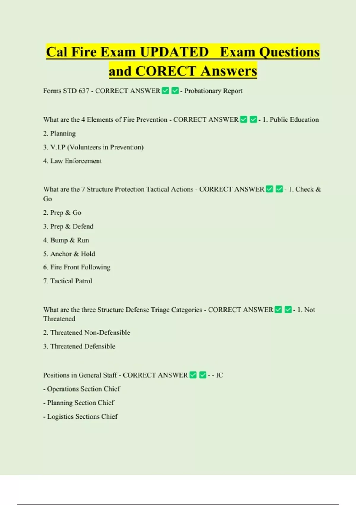 Cal Fire Exam UPDATED Exam Questions and CORECT Answers Forms STD 637 - CORRECT ANSWER - Probationary Report What are the 4 Elements of Fire Prevention - CORRECT ANSWER 2. Planning 3. V.I.P (Volunteers in Prevention) 4. Law Enforcement - 1. Public Education What are the 7 Structure Protection Tactical Actions - CORRECT ANSWER Go