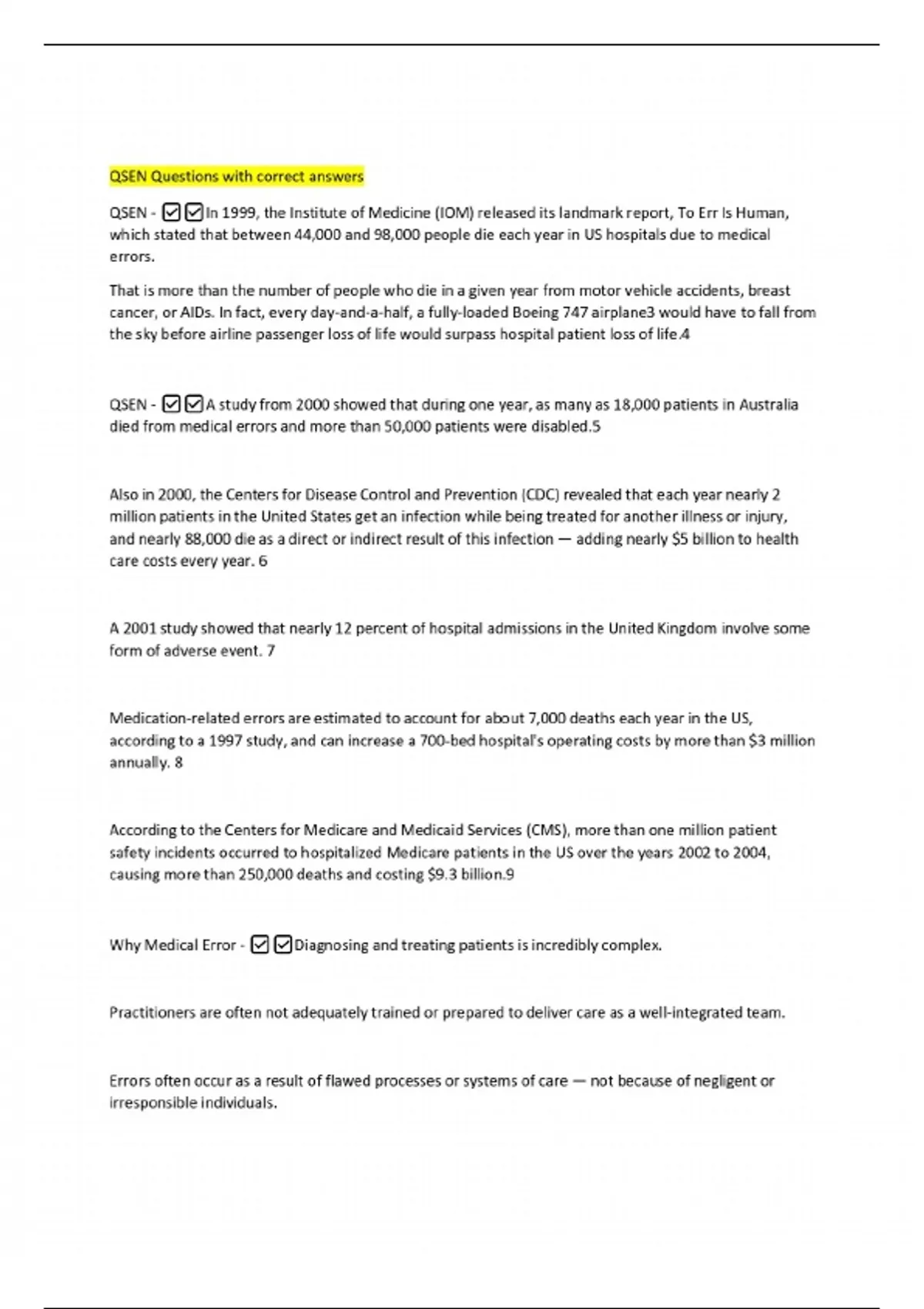 QSEN Questions with correct answers QSEN - In 1999, the Institute of Medicine (IOM) released its landmark report, To Err Is Human, which stated that between 44,000 and 98,000 people die each year in US hospitals due to medical errors. That is more than the number of people who die in a given year from motor vehicle accidents, breast cancer, or AIDs. In fact, every day-and-a-half, a fully-loaded Boeing 747 airplane3 would have to fall from the sky before airline passenger loss of life would surpass hospital patient loss of life.4 QSEN - A study from 2000 showed that during one year, as many as 18,000 patients in Australia died from medical errors and more than 50,000 patients were disabled.5 Also in 2000, the Centers for Disease Control and Prevention (CDC) revealed that each year nearly 2 million patients in the United States get an infection while being treated for another illness or injury, and nearly 88,000 die as a direct or indirect result of this infection — adding nearly $5 billion to health