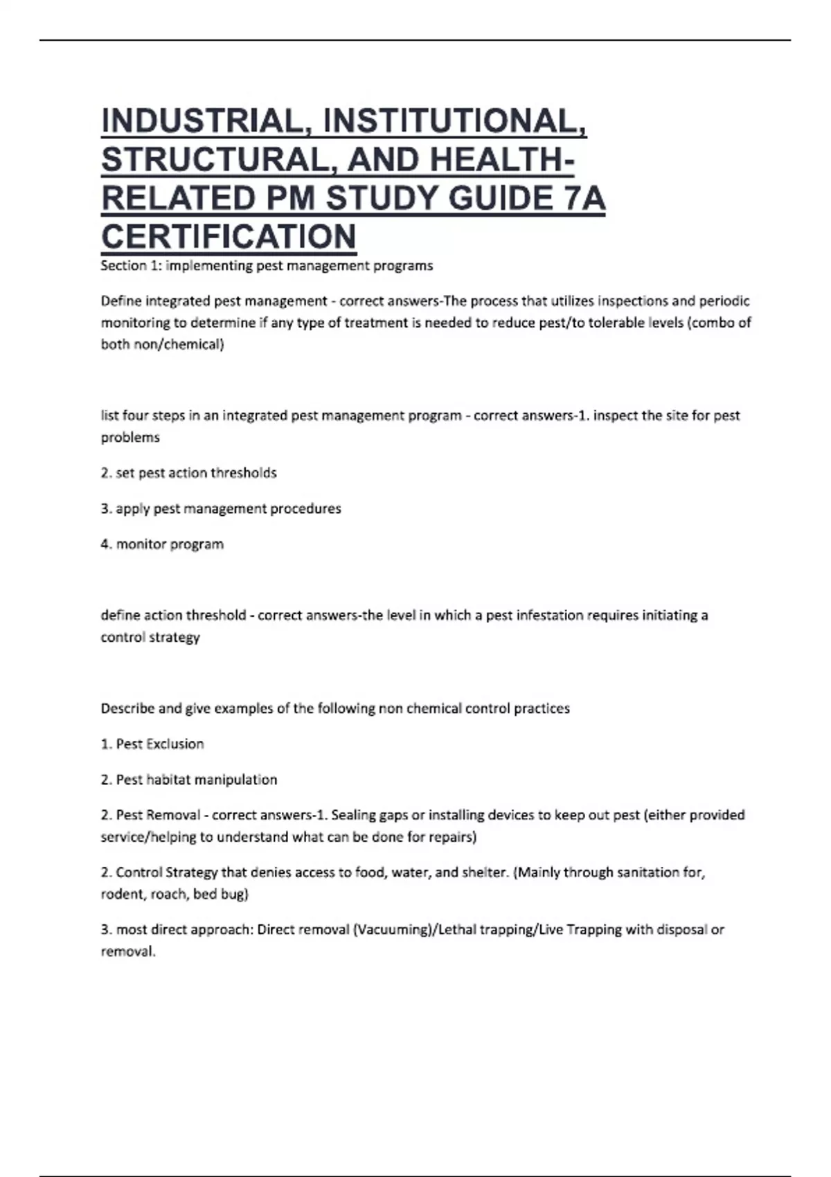 INDUSTRIAL, INSTITUTIONAL, STRUCTURAL AND HEALTH RELATED PEST MANAGEMENT - CHAPTER 1 What agency is responsible for the enforcement of federal pesticide law and regulation? - correct answers-EPA Which law requires federal registration of pesticides shipped in interstate commerce? - correct answers-FIFRA Which law prohibits the use of any registered pesticide in a manner inconsistent with label directions? - correct answers-FEPCA Any commercial applicator who violates any provision of FIFRA may be assessed a civil penalty of no more than? - correct answers-$5,000 Which agency is responsible for the protection of the Health, Safety and Welfare of Pest Control employees and the general public from the Hazards of pesticide use in TN? - correct answers-TDA The TDA certification and enforcement functions are coordinated primarily through what division of TDA? - correct answers-Regulatory Services Division Pesticides that may cause adverse effects on the environment and/or the applicator, unless subject to additional regulatory restrictions are classified as? - correct answers-Restricted-use Pesticides A certification period lasts for how many years? - correct answers-3 years One may earn up to what percentage in-house points in the recertification program? - correct answers-50%