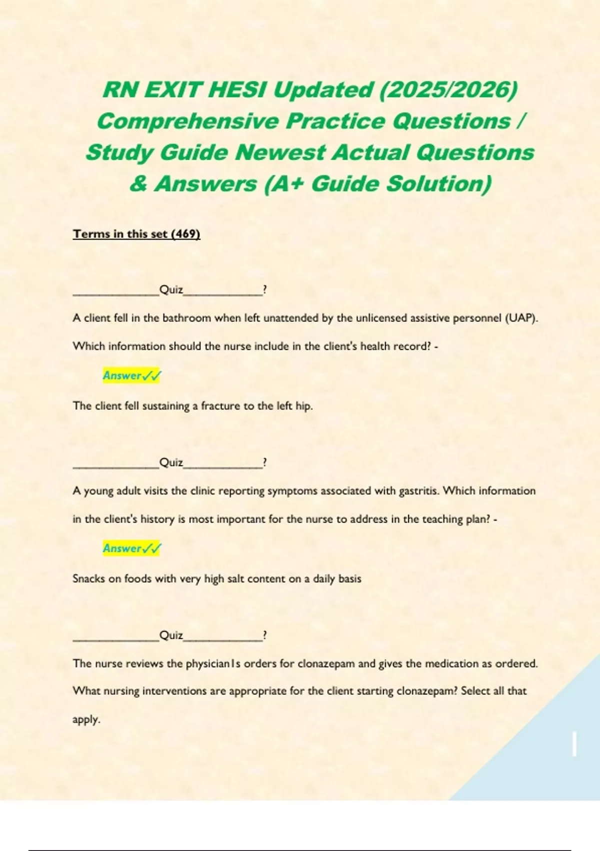 RN EXIT HESI Updated (2025/2026) Comprehensive Practice Questions / Study Guide Newest Actual Questions & Answers (A+ Guide Solution) Terms in this set (469) _____________Quiz____________? A client fell in the bathroom when left unattended by the unlicensed assistive personnel (UAP). Which information should the nurse include in the client's health record? - Answer The client fell sustaining a fracture to the left hip. _____________Quiz____________? A young adult visits the clinic reporting symptoms associated with gastritis. Which information in the client's history is most important for the nurse to address in the teaching plan? - Answer Snacks on foods with very high salt content on a daily basis _____________Quiz____________? The nurse reviews the physician1s orders for clonazepam and gives the medication as ordered. What nursing interventions are appropriate for the client starting clonazepam? Select all that apply. A. Screen for orthostatic hypotension B. Provide oral care at least twice a day C. Monitor calcium levels D. Assess mental status regularly E. Assist the client to the bathroom F. Have an opioid agonist at the bedside - Answer A. Screen for orthostatic hypotension B. Provide oral care at least twice a day D. Assess mental status regularly E. Assist the client to the bathroom _____________Quiz____________? What other treatments might be helpful for this client? Select all that apply. A. Phototherapy B. Administration of lithium C. Consciousness-raising D. Cognitive behavioral therapy E. Animal therapy F. Electroconvulsivetherapy - Answer D. Cognitive-behavioral therapy E. Animal therapy _____________Quiz____________? A client with a history of type 1 diabetes mellitus {DM) and asthma is readmitted to the unit for the third time in two months with a current fasting blood sugar (FBS) is 325 mg/dL (18 mmol/L). The client describes to the nurse of not understanding why the blood glucose level continues to be out of control. Which intervention{s) should the nurse implement? {Select all that apply.) Blood Glucose Reference - 74 to 106 mg/dL {4.1 to 5.9 mmol/L) A. Have the client demonstrate technique used to monitor blood glucose levels. B. Evaluate the client's asthma medications that can elevate the blood glucose. C. Ask the client if they want a different manufacturer's glucose monitoring device. D. Have the client describe a typical day at work, home, and social activities. E. Determine if the client is using a new insulin-led learning administration. - Answer A. Have the client demonstrate technique used to monitor blood glucose levels. B. Evaluate the client's asthma medications that can elevate the blood glucose. D. Have the client describe a typical day at work, home, and social activities. E. Determine if the client is using a new insulin-led learning administration.
