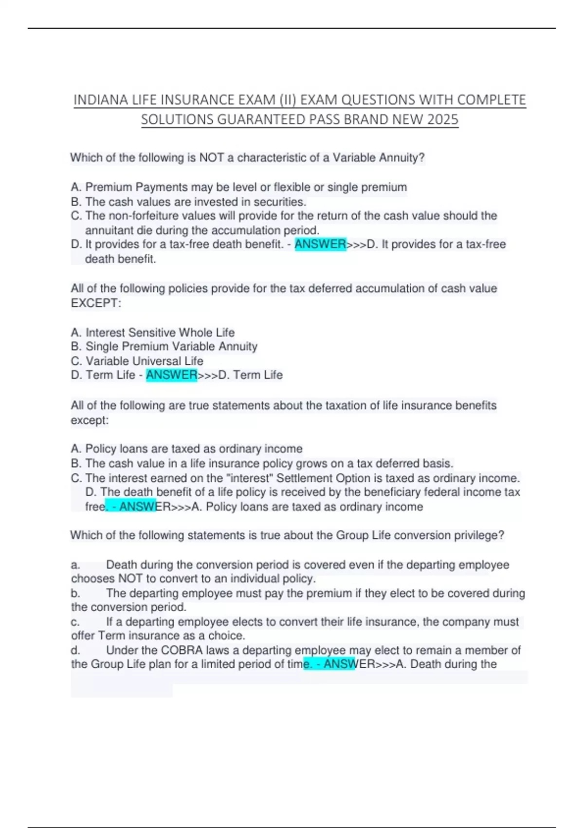INDIANA LIFE INSURANCE EXAM (II) EXAM QUESTIONS WITH COMPLETE
