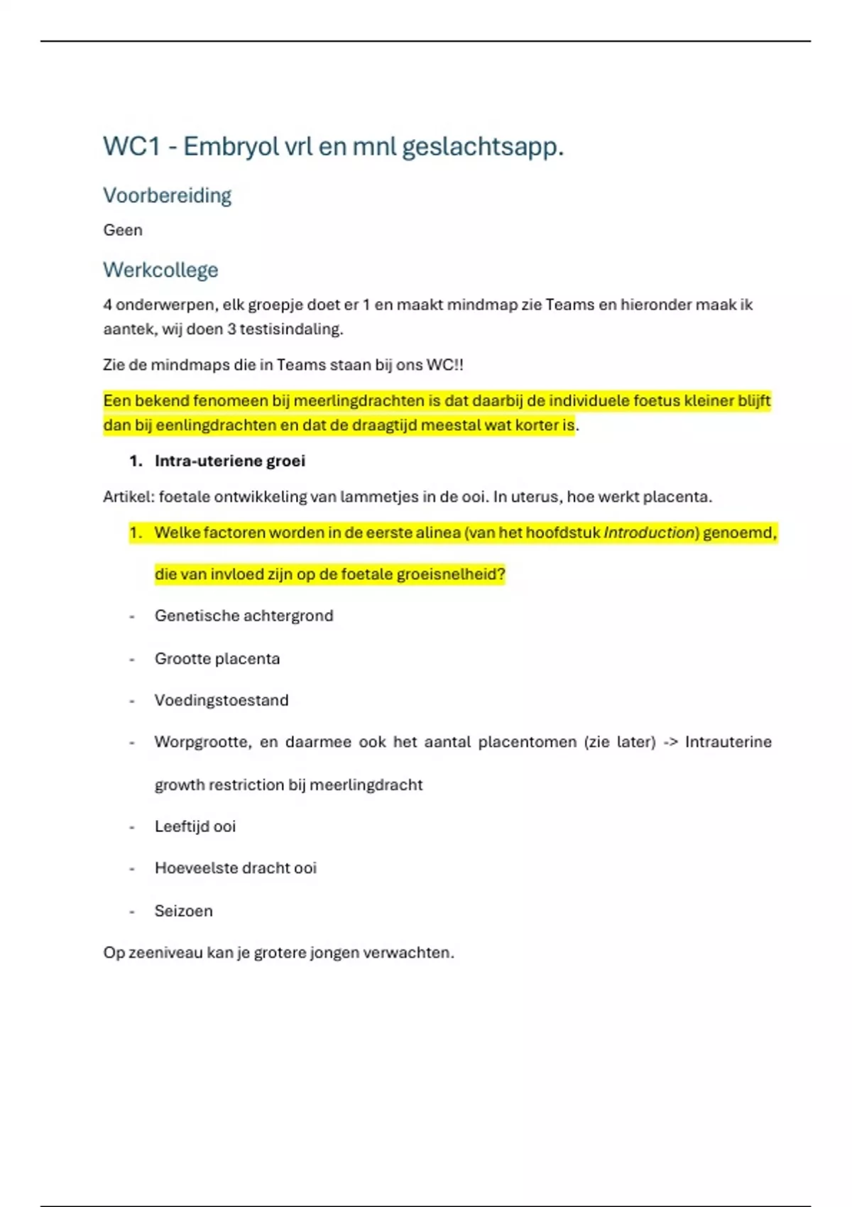 - Worpgrootte, en daarmee ook het aantal placentomen (zie later) -> Intrauterine