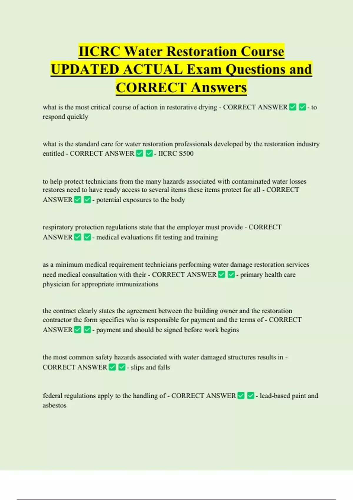 IICRC Water Restoration Course UPDATED ACTUAL Exam Questions and CORRECT Answers what is the most critical course of action in restorative drying - CORRECT ANSWER respond quickly - to what is the standard care for water restoration professionals developed by the restoration industry entitled - CORRECT ANSWER - IICRC S500 to help protect technicians from the many hazards associated with contaminated water losses restores need to have ready access to several items these items protect for all - CORRECT ANSWER - potential exposures to the body