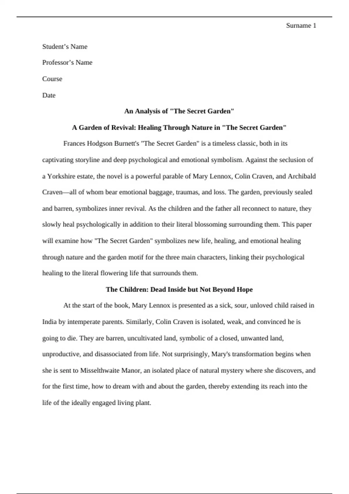 will examine how "The Secret Garden" symbolizes new life, healing, and emotional healing