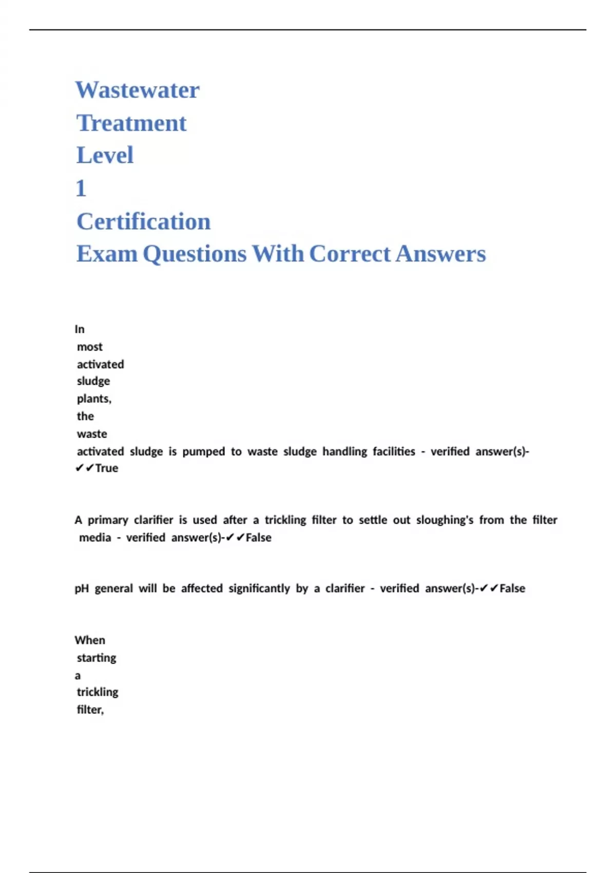Wastewater Treatment Level 1 Certification Exam Questions With Correct Answers.