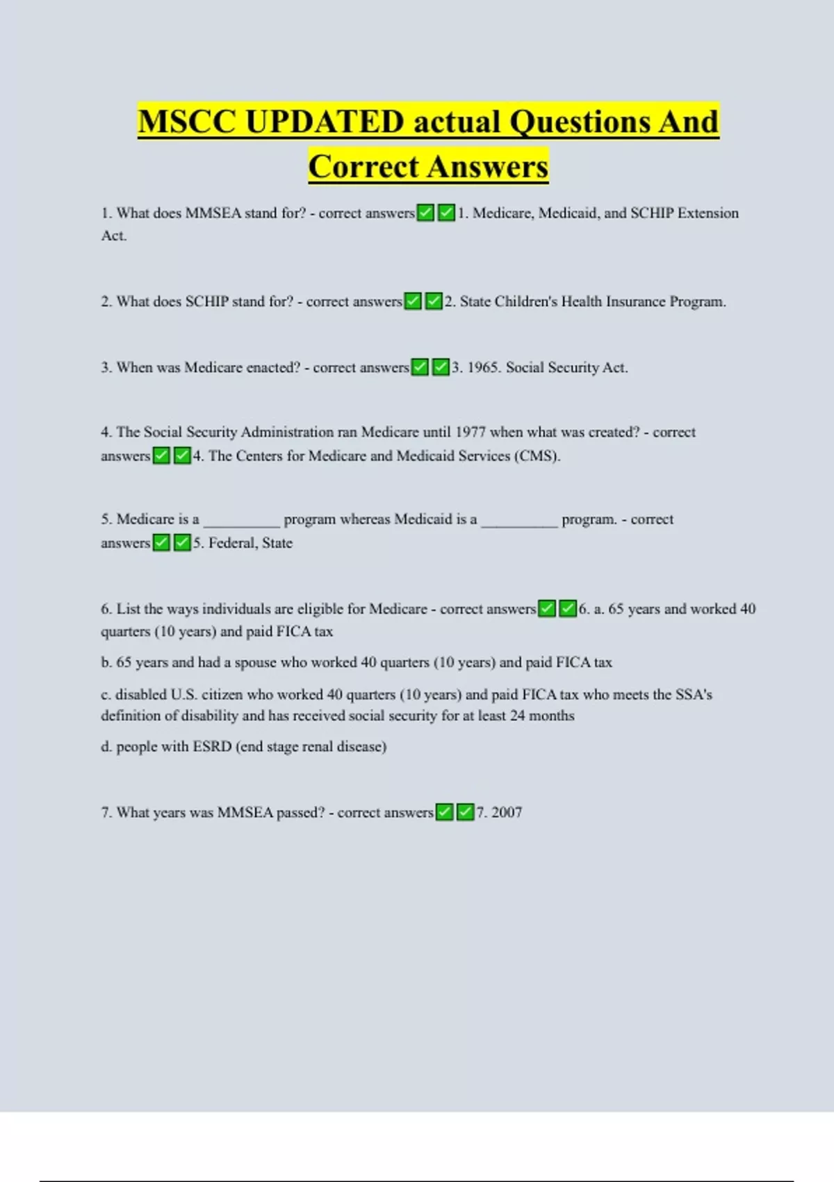 MSCC UPDATED actual Questions And Correct Answers 1. What does MMSEA stand for? - correct answers Act. 2. What does SCHIP stand for? - correct answers 3. When was Medicare enacted? - correct answers 1. Medicare, Medicaid, and SCHIP Extension 2. State Children's Health Insurance Program. 3. 1965. Social Security Act. 4. The Social Security Administration ran Medicare until 1977 when what was created? - correct answers 4. The Centers for Medicare and Medicaid Services (CMS). 5. Medicare is a __________ program whereas Medicaid is a __________ program. - correct answers 5. Federal, State 6. List the ways individuals are eligible for Medicare - correct answers quarters (10 years) and paid FICA tax 6. a. 65 years and worked 40 b. 65 years and had a spouse who worked 40 quarters (10 years) and paid FICA tax c. disabled U.S. citizen who worked 40 quarters (10 years) and paid FICA tax who meets the SSA's definition of disability and has received social security for at least 24 months d. people with ESRD (end stage renal disease)