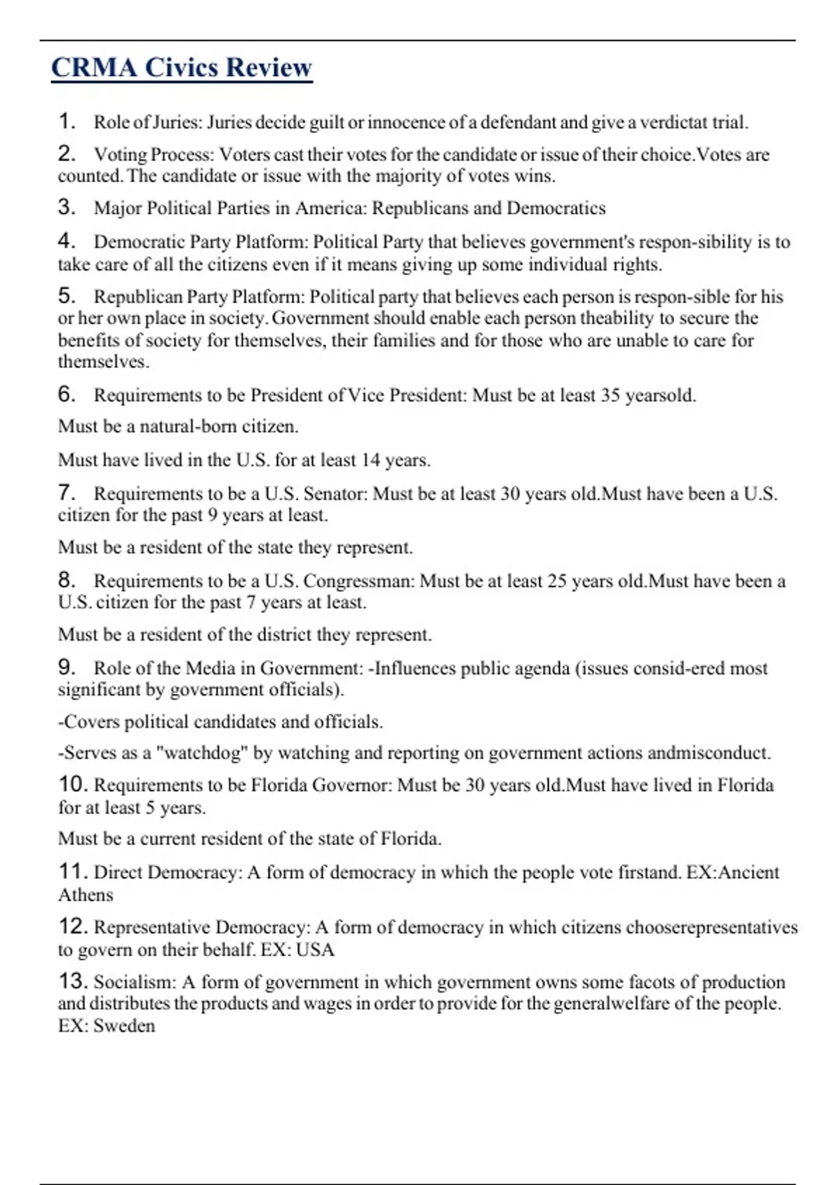 CRMA Civics Review (LATEST ) | QUESTIONS & VERIFIED ANSWERS WITH FULL RATIONALES | A+ GRADE GUARANTEED