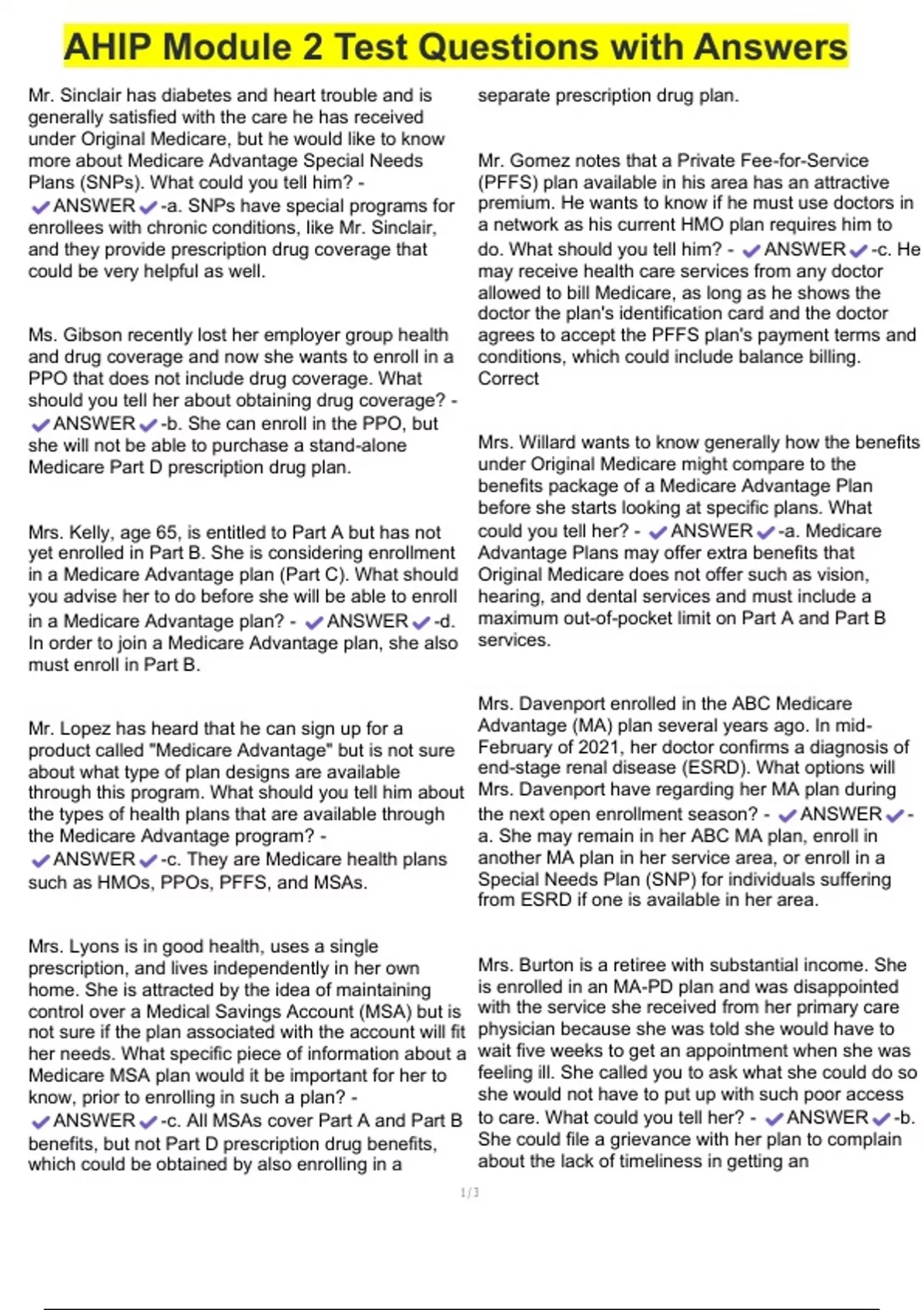 ANSWER -c. All MSAs cover Part A and Part B to care. What could you tell her? - ANSWER -b.