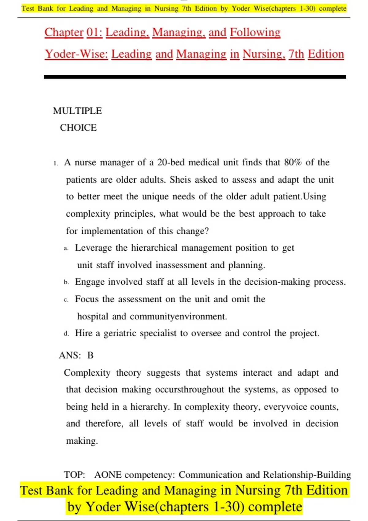 Test !!Bank !!for !!Leading !!and !!Managing !!in !!Nursing !!7th !!Edition !!by !!Yoder !!Wise(chapters !!1-30) !!complete