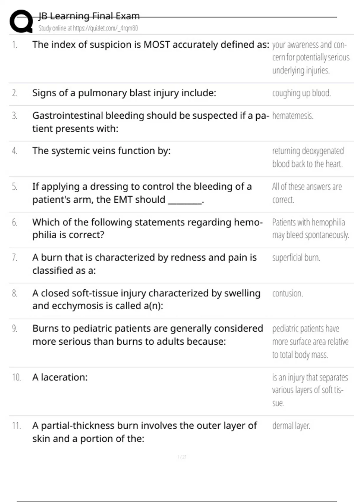 11. A partial-thickness burn involves the outer layer of dermal layer.
