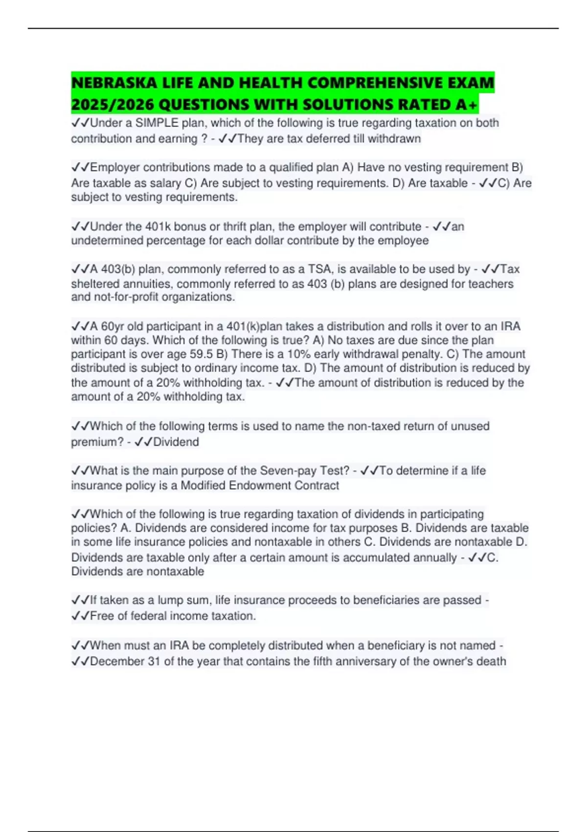 NEBRASKA LIFE AND HEALTH COMPREHENSIVE EXAM 2025/2026 QUESTIONS WITH SOLUTIONS RATED A+