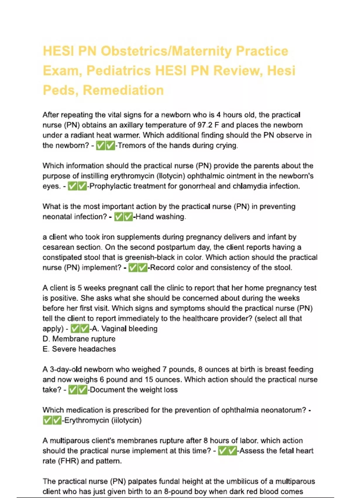 HESI PN Obstetrics Maternity Practice Exam, Pediatrics HESI PN Review Questions and answers