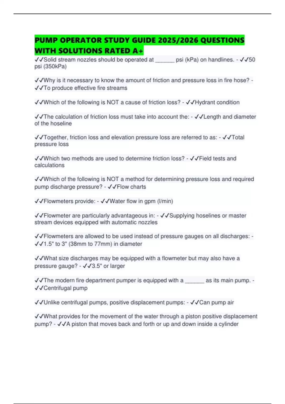 PUMP OPERATOR STUDY GUIDE 2025/2026 QUESTIONS WITH SOLUTIONS RATED A+