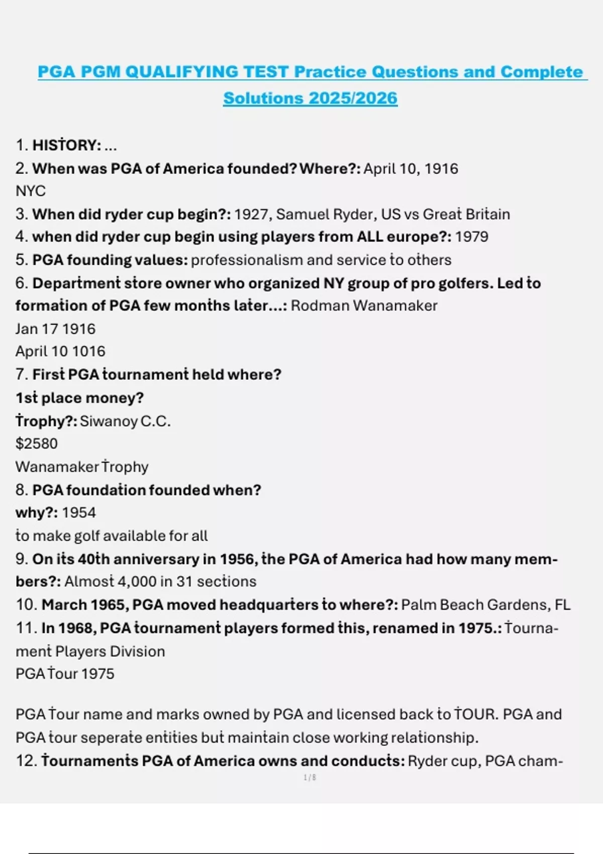 12. Ṫournamenṫs PGA of America owns and conducṫs: Ryder cup, PGA cham-