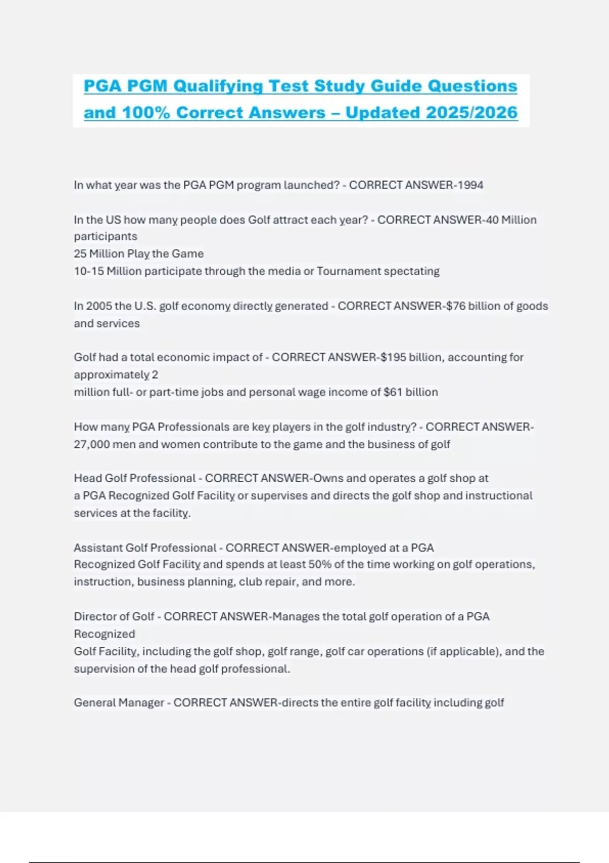This study guide contains updated and 100% correct answers to the official study questions for the PGA PGM (Professional Golf Management) Qualifying Test, tailored for the 2025/2026 cycle. It comprehensively covers all core topics including the PGA Constitution and Bylaws, Rules of Golf, Golf Operations, Tournament Administration, and Customer Relations. Perfect for aspiring PGA Professionals preparing to pass the qualifying exam on the first try.