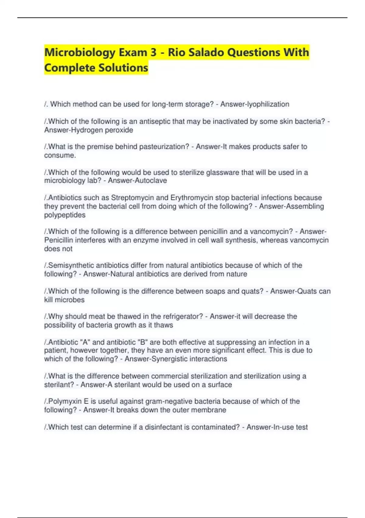 Microbiology Exam 3 - Rio Salado Questions With Complete Solutions /. Which method can be used for long-term storage? - Answer-lyophilization /.Which of the following is an antiseptic that may be inactivated by some skin bacteria? - Answer-Hydrogen peroxide /.What is the premise behind pasteurization? - Answer-It makes products safer to consume. /.Which of the following would be used to sterilize glassware that will be used in a microbiology lab? - Answer-Autoclave /.Antibiotics such as Streptomycin and Erythromycin stop bacterial infections because they prevent the bacterial cell from doing which of the following? - Answer-Assembling polypeptides /.Which of the following is a difference between penicillin and a vancomycin? - Answer-Penicillin interferes with an enzyme involved in cell wall synthesis, whereas vancomycin does not /.Semisynthetic antibiotics differ from natural antibiotics because of which of the following? - Answer-Natural antibiotics are derived from nature /.Which of the following is the difference between soaps and quats? - Answer-Quats can kill microbes /.Why should meat be thawed in the refrigerator? - Answer-it will decrease the possibility of bacteria growth as it thaws /.Antibiotic "A" and antibiotic "B" are both effective at suppressing an infection in a patient, however together, they have an even more significant effect. This is due to which of the following? - Answer-Synergistic interactions /.What is the difference between commercial sterilization and sterilization using a sterilant? - Answer-A sterilant would be used on a surface /.Polymyxin E is useful against gram-negative bacteria because of which of the following? - Answer-It breaks down the outer membrane /.Which test can determine if a disinfectant is contaminated? - Answer-In-use test /.Dry heat and moist heat differ because of which of the following? - Answer-Moist heat penetrates cells more effectively /.Using a narrow-spectrum antibiotic is better than a broad-spectrum antibiotic because of which of the following? - Answer-Narrow-spectrum antibiotics will have less of a chance of killing normal microbiota /.A person is hiking and runs out of drinking water. They find a stream and decide to use the chlorine tablets they brought to sanitize the water. This would be a good way to make the water safe to drink because of which of the following? - Answer-The chlorine will break up the molecules of the microbes in the water /.When a phlebotomist cleans an area of the skin with alcohol before drawing blood on a patient, their goal is to do which of the following? - Answer-Lower the number of bacteria on the skin /.Why is washing your hands with (non-antibacterial) soap and water an effective way to reduce bacteria? - Answer-It is degerming your hands /.Which of the following would target Mycobacterium tuberculosis? - Answer-Isoniazid /.Mouthwash, antibacterial soap, and Lysol are all related because of which of the following? - Answer-They contain phenolic compounds /.Which of the following would be the least selectively toxic treatment for a bacterial infection? - Answer-Polymyxin B /.Which of the following would be used to control microbial counts in a liquid that could not be exposed to heat? - Answer-Filtration /.If a person has athlete's foot, the cream they use to treat it will suppress the mold enough for the immune defenses to rid the skin of the infection because of which of the following? - Answer-The cream is fungistatic /.Why can quinolones target bacterial replication? - Answer-Bacteria have different enzymes /.Which scientist's research showed penicillin was an effective antibiotic in treating infections in animals? - Answer-Chain /.what microbes can be pathogenic? - Answer-protozoa, fungi, bacteria, helminths, viruses /.what are most infections caused by? - Answer-bacteria or viruses /.is illness the same as disease - Answer-no /.what does infection mean? - Answer-infection means that. person has been colonized with a microbial population /.most bacteria that cause disease in humans are ___ - Answer-mesophilic /.what control microbial growth? - Answer-heat /.how does heat affect cells? - Answer-denaturation of proteins the intensity depending on time, temp, and moisture /.kill means - Answer-complete death of a microbe /.bactericidal - Answer-indicated that bacterial population is dead /.bacteriostatic - Answer-this means the population is low and not increasing in size /.sterilzation - Answer-completely kill everything which is not always neccessary /.sanitize - Answer-reduce the population to food safe levels /.cooking food can ____ - Answer-kill most bacteria that will cause infection /.S. aureus - Answer-can replicate and produce toxins that will remain after the food Is heated if the toxin is in/on the food prior to cooking /.Clostridium botulinum - Answer-toxin that can be ingested and cause sever disease remains dormant until activated toxins will cause paralysis of muscles, including muscles that control breathing /.pasteruization - Answer-reducing microbial counts in milk because sterilization would denature all proteins in milk, reducing its nutritional value required to be refrigerated after and can go bad bc bacteria may be present after the process /.freezing - Answer-a way of food preservation and can be accompanied by other physical and chemical methods of control /.how does adding salt and sugar help with freezing items - Answer-it creates a hypertonic environment that suppresses the growth of organisms that are not halophiles /.nitrites - Answer-used as a preservative in deli meats, can be carcinogenic /.autoclave - Answer-uses steam, pressure, and high temperature to sterilization items gets to the temperature of 121 C or 250 F only takes 15 minutes /.antiseptic - Answer-strong enough to kill some of the bacteria on the patients skill without harming the tissue goal is to reduce the possibility of bacteria from the patients skin or the surgeon getting inside the body /.seps