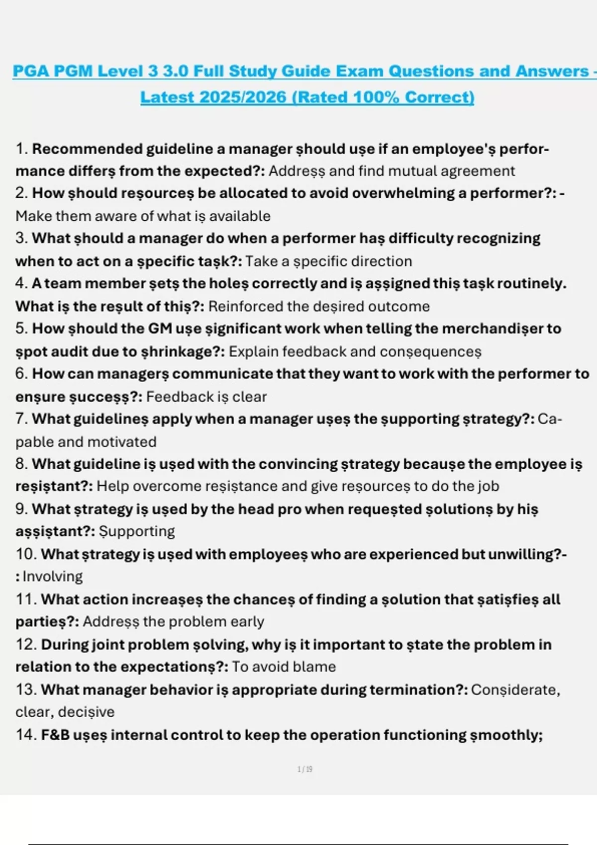 This document is a complete study guide for PGA PGM Level 3 (3.0), featuring the latest 2025/2026 exam questions and 100% correct answers. It covers all required modules including Player Development Programs, Golf Operations, Teaching & Coaching, Facility Management, and Business Planning. Designed for PGA associates seeking mastery of Level 3 content and confident progression toward PGA membership.