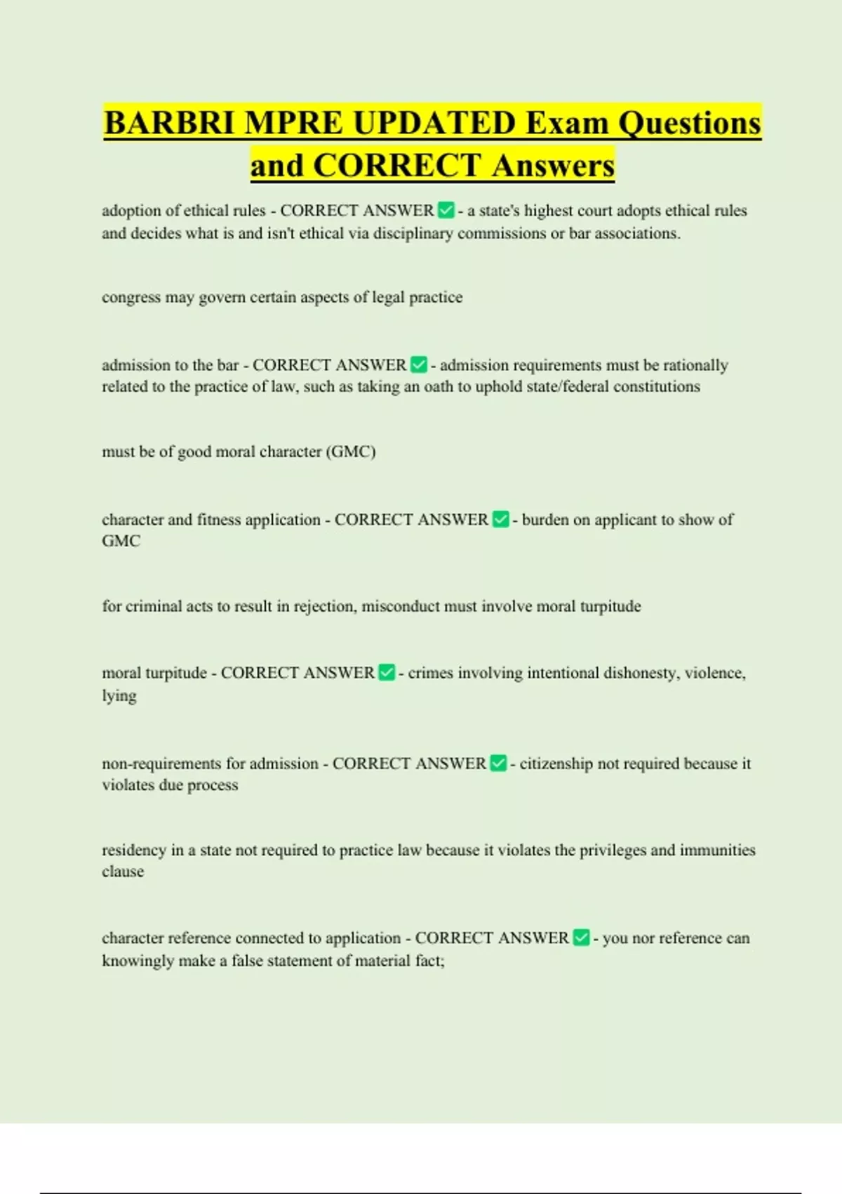 BARBRI MPRE UPDATED Exam Questions and CORRECT Answers adoption of ethical rules - CORRECT ANSWER - a state's highest court adopts ethical rules and decides what is and isn't ethical via disciplinary commissions or bar associations. congress may govern certain aspects of legal practice admission to the bar - CORRECT ANSWER - admission requirements must be rationally related to the practice of law, such as taking an oath to uphold state/federal constitutions