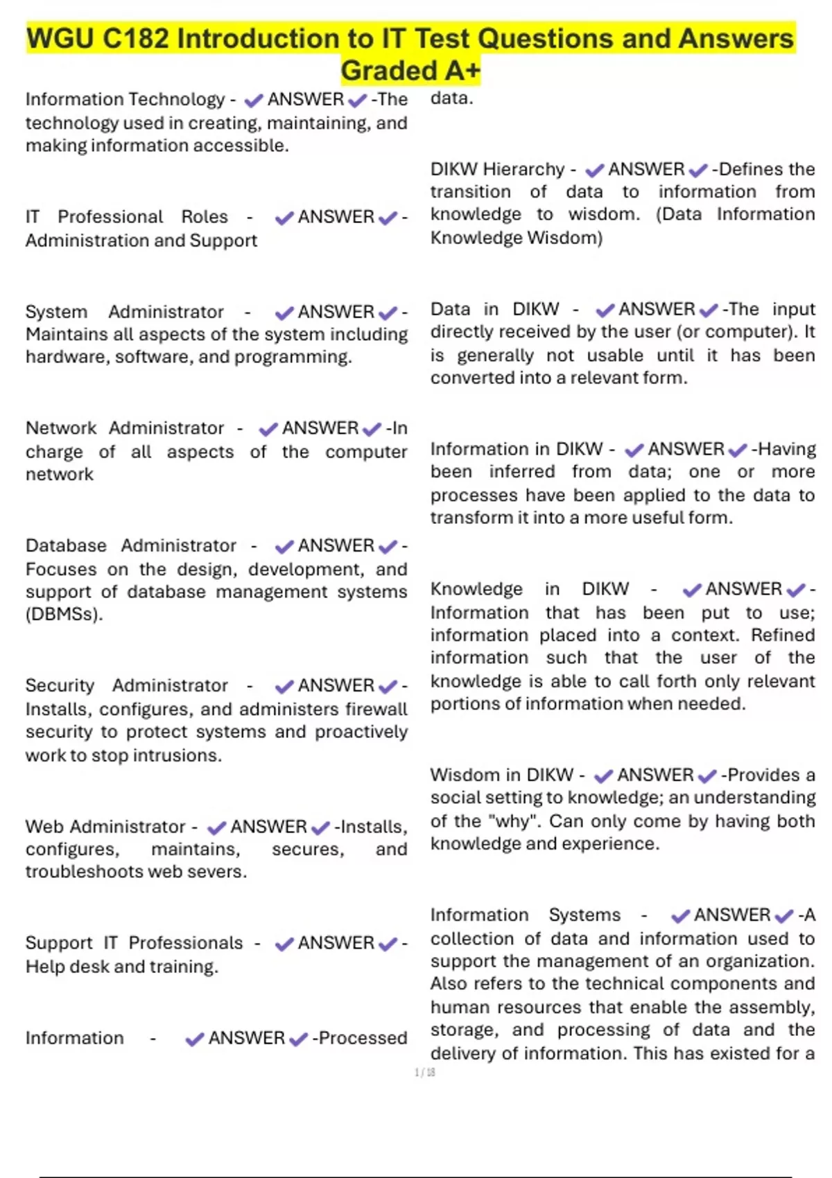 1 / 18 WGU C182 Introduction to IT Test Questions and Answers Graded A+ Information Technology - ANSWER -The technology used in creating, maintaining, and making information accessible. IT Professional Roles - ANSWER - Administration and Support System Administrator - ANSWER - Maintains all aspects of the system including hardware, software, and programming. Network Administrator - ANSWER -In charge of all aspects of the computer network Database Administrator - ANSWER - Focuses o
