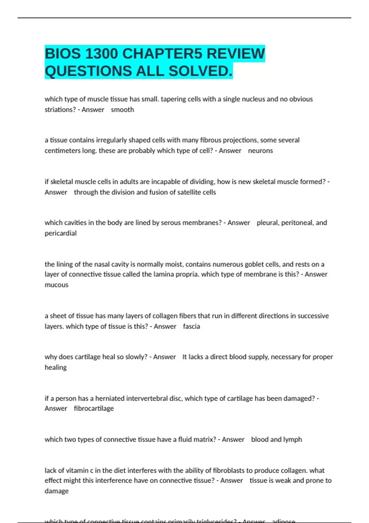 BIOS 1300 CHAPTER5 REVIEW QUESTIONS ALL SOLVED.