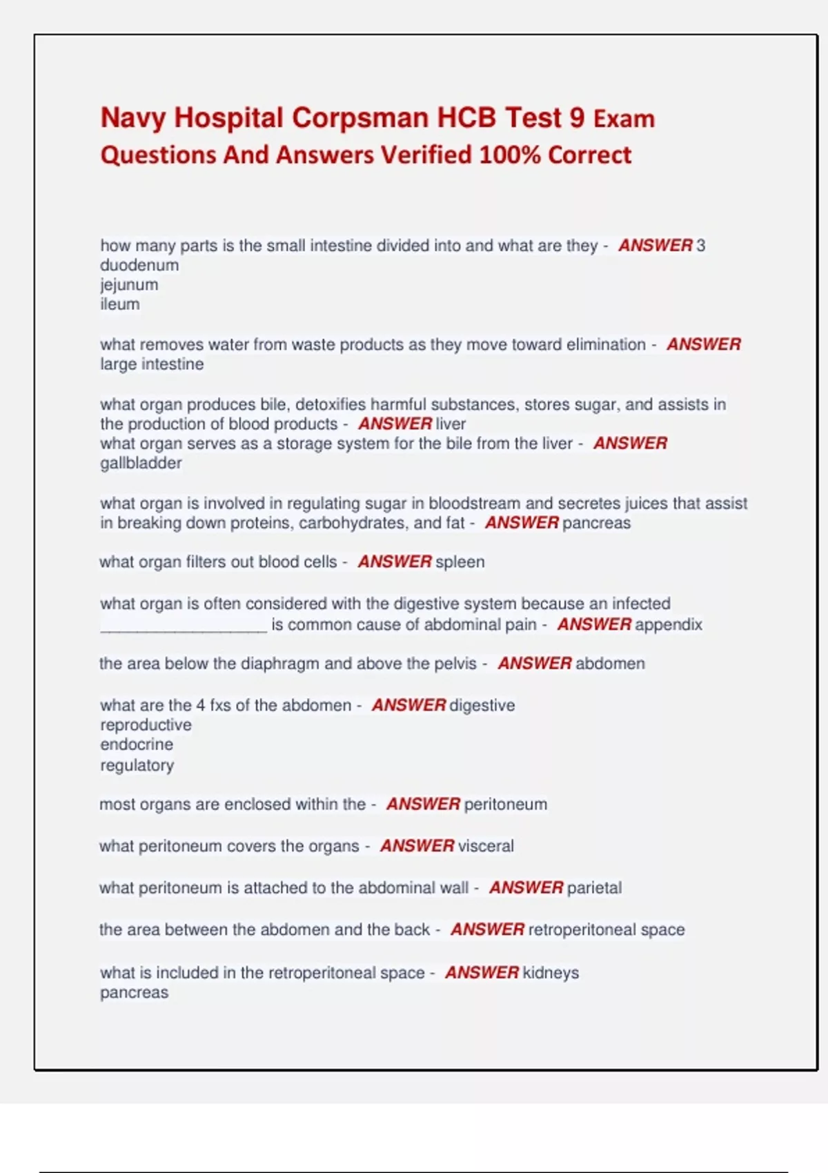 Navy Hospital Corpsman HCB Test 9 Exam Questions And Answers Verified 100% Correct how many parts is the small intestine divided into and what are they - ANSWER 3 duodenum jejunum ileum what removes water from waste products as they move toward elimination - ANSWER large intestine what organ produces bile, detoxifies harmful substances, stores sugar, and assists in the production of blood products - ANSWER liver what organ serves as a storage system for the bile from the liver - ANSWER gallbladder what organ is involved in regulating sugar in bloodstream and secretes juices that assist in breaking down proteins, carbohydrates, and fat - ANSWER pancreas what organ filters out blood cells - ANSWER spleen what organ is often considered with the digestive system because an infected __________________ is common cause of abdominal pain - ANSWER appendix the area below the diaphragm and above the pelvis - ANSWER abdomen what are the 4 fxs of the abdomen - ANSWER digestive reproductive endocrine regulatory most organs are enclosed within the - ANSWER peritoneum what peritoneum covers the organs - ANSWER visceral what peritoneum is attached to the abdominal wall - ANSWER parietal the area between the abdomen and the back - ANSWER retroperitoneal space what is included in the retroperitoneal space - ANSWER kidneys pancreas aorta the bladder and most of the rectum are positioned where to the peritoneum - ANSWER inferior a bluish periumbilical discoloration - ANSWER Cullen's sign What does Cullen's sign indicate? - ANSWER intra abdominal bleeding hyperactive bowel sounds may occur with - ANSWER gastoenteritis early intestinal obstruction hunger hypoacitve bowel sounds occur with - ANSWER peritonitis an infection of the appendix, most common cause of person needing surgery 1 in 15 develop this - ANSWER appendicitis a presents with nausea, pain in umbilicus, followed by RLQ pain what do you think the pt has - ANSWER appendicitis whats the plan for appendicitis - ANSWER appendectomy antibiotics b4 surgery inflammation of the gallbaldder, often called gall stones - ANSWER chloecystitis pt presents with RUQ and epigastic pain, pain radiates to shoulder and chest and can be confused for cardiac complaints, palpation of RUQ causes pain - ANSWER chloecystitis whats the plan for chloecystitis - ANSWER laparoscope surgery iv antibiotics inflammation of the pancreas, common in patients with chronic alcohol problems - ANSWER pancreatitis Patient presents with pain in the epigastric area radiating to the back/shoulders increased pain while walking/supine position worsened by sitting/leaning forward nausea - ANSWER Pancreatitis What's the plan for pancreatitis - ANSWER Refer to provider Saclike mucosal out pouching's through the colonic muscle - ANSWER Diverticula May involve any part of the Gastro intestinal track the sigmoid is the most commonly affected location most patients are asymptomatic - ANSWER Diverticulitis Patient presents with LLQ pain anorexia nausea vomiting and altered bowel Habits (constipation) pain localizes to site of inflammation possible abdominal distention lower G.I. bleed - ANSWER Diverticulitis What's the plan for diverticulitis - ANSWER Clear liquid diet Antibiotics (7 to 10 days) What is the hemorrhoid degree: Hemorrhoids do not prolapse - ANSWER 1st degree What is the hemorrhoid degree: prolapse through the anus on straining but reduce spontaneously - ANSWER 2nd degree What is the Hemorrhoid degree: protrude and require digital reduction - ANSWER 3rd degree What is the hemorrhoid degree: cannot be reduced - ANSWER 4th degree Hole in the muscular layers of the abdominal wall allowing tissue usually intestine to protrude up against the skin - ANSWER Hernia Acquired herniation through defect in transversalis fascia Of abdominal wall medial to inferior epigastric vessels increased frequency with age as fascia weakens - ANSWER Direct inguinal Congenital herniation lateral to the inferior epigastric vessels through internal inguinal ring into inguinal canal - ANSWER Indirect inguinal What are the two types of hernias - ANSWER inguinal and femoral Herniation that descends to the femoral canal deep into The inguinal ligament - ANSWER Femoral A long tube inserted through the nose into the stomach that can be used to deliver nutrients, the device can also be used to suction out the stomach contents - ANSWER NG tube A feeding tube surgically implanted through the abdominal wall and into the stomach and secured with a balloon - ANSWER G tube Most frequently used feeding tube, longer, smaller caliber tube that terminates in the