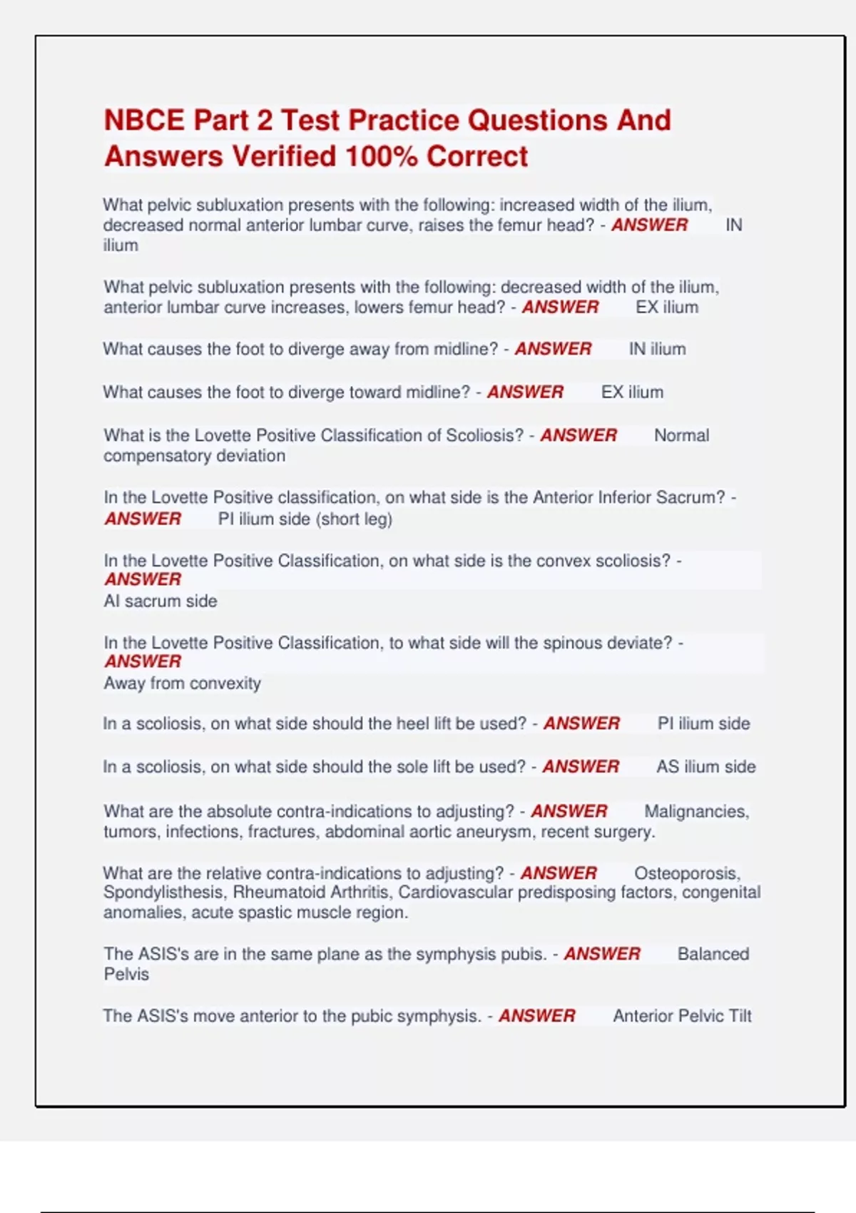 NBCE Part 2 Test Practice Questions And Answers Verified 100% Correct What pelvic subluxation presents with the following: increased width of the ilium, decreased normal anterior lumbar curve, raises the femur head? - ANSWER IN ilium What pelvic subluxation presents with the following: decreased width of the ilium, anterior lumbar curve increases, lowers femur head? - ANSWER EX ilium What causes the foot to diverge away from midline? - ANSWER IN ilium What causes the foot to diverge toward midline? - ANSWER EX ilium What is the Lovette Positive Classification of Scoliosis? - ANSWER Normal compensatory deviation In the Lovette Positive classification, on what side is the Anterior Inferior Sacrum? - ANSWER PI ilium side (short leg) In the Lovette Positive Classification, on what side is the convex scoliosis? - ANSWER AI sacrum side In the Lovette Positive Classification, to what side will the spinous deviate? - ANSWER Away from convexity In a scoliosis, on what side should the heel lift be used? - ANSWER PI ilium side In a scoliosis, on what side should the sole lift be used? - ANSWER AS ilium side What are the absolute contra-indications to adjusting? - ANSWER Malignancies, tumors, infections, fractures, abdominal aortic aneurysm, recent surgery. What are the relative contra-indications to adjusting? - ANSWER Osteoporosis, Spondylisthesis, Rheumatoid Arthritis, Cardiovascular predisposing factors, congenital anomalies, acute spastic muscle region. The ASIS's are in the same plane as the symphysis pubis. - ANSWER Balanced Pelvis The ASIS's move anterior to the pubic symphysis. - ANSWER Anterior Pelvic Tilt The ASIS's move posterior to the pubic symphysis. - ANSWER Posterior Pelvic Tilt What type of lordosis is seen in an Anterior Pelvic Tilt? - ANSWER Hyperlordosis What type of lordosis is seen in a Posterior Pelvic Tilt? - ANSWER Hypolordosis In an anterior pelvic tilt, what muscles will be lengthened/inhibited? - ANSWER Hamstrings, gluteals, abdominals. In an anterior pelvic tilt, what muscles are hypertonic/facilitated? - ANSWER Psoas, quadriceps, erector spinae In a posterior pelvic tilt, what muscles are lengthened/inhibited? - ANSWER Psoas, quadriceps, erector spinae In a posterior pelvic tilt, what muscles are hypertonic/facilitated? - ANSWER Hamstrings, gluteals, abdominals In upper cross syndrome, what muscles are hypertonic/facilitated? - ANSWER Levator scapulae, pectoralis major, upper trapezius, sternocleidomastoid, scalenes, suboccipitals In upper cross syndrome, what muscles are lengthened/inhibited? - ANSWER Rhomboids, lower & middle trapezius, serratus anterior, teres minor, longus coli and capitus In the sub-occipital triangle, where is the Obliquus Capitus Superior located? - ANSWER C1 transverse process to occiput In the sub-occipital triangle, where is the Obliquus Capitus Inferior located? - ANSWER spinous process of Axis to transverse process of Atlas In the sub-occipital triangle, where is the Rectus Capitus Posterior Major located? - ANSWER spinous process of Axis to Occiput In the sub-occipital triangle, where is the Rectus Capitus Posterior Minor located? - ANSWER Posterior tubercle to Occiput What type of exercise is done non-weight bearing, in which the hand or foot is free to move? - ANSWER Open Chain Exercise What type of exercise is performed with the hand or foot fixed and cannot move, usually stays in constant contact with the surface? - ANSWER Closed Chain Exercise When looking at the gravity weight line in an anterior view, what is being assessed? - ANSWER head tilt or rotation, shoulder height, arm carriage, hip height, feet malposition. Where is the gravity weight line when assessing in a lateral manner? - ANSWER External auditory meatus, anterior body C7, middle of shoulder, anterior 1/3 of sacral base, middle of the hip joint, posterior to the patella, 1" anterior to lateral malleolus When assessing the gravity weight line in a posterior manner, what is being viewed? - ANSWER Scapula winging/flaring, scoliosis, foot angle. What Plane of movement is seen in the cervical facets? - ANSWER transverse What plane of movement is seen in the thoracic facets? - ANSWER coronal What plane of movement is seen in the lumbar facets? - ANSWER sagittal What plane of movement is seen in the lumbosacral facets? - ANSWER coronal What type of motion is seen in the cervical facets? - ANSWER rotation What type of motion is seen in the thoracic facets? - ANSWER lateral flexion What type of motion is seen in the lumbar facets? - ANSWER flexion/extension What type of motion is seen in the lumbosacral facets? - ANSWER lateral flexion In the coupled motion of the cervical spine, which way does the spinous rotate? - ANSWER Into Convexity In the coupled motion of the lumbar spine, which way does the spinous rotate? - ANSWER Into Concavity Structural Landmarks: EOP - ANSWER External Occiput Structural Landmarks: AXIS - ANSWER First Palpable Spinous Structural Landmarks: C3 - ANSWER Hyoid Bone, Carotid Artery Structural Landmarks: C4,5 - ANSWER Thyroid Cartilage Structural Landmarks: C6 - ANSWER Cricoid Cartilage, Carotid tubercle, last