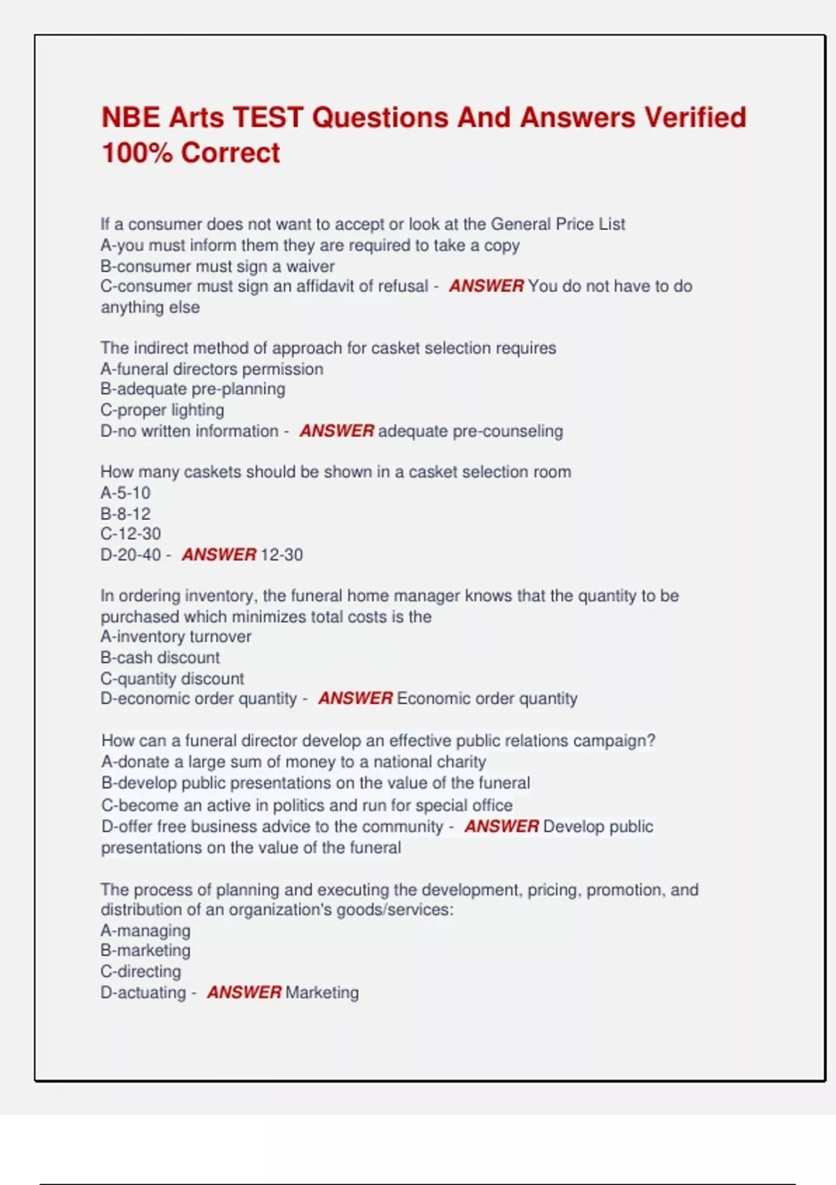 NBE Arts TEST Questions And Answers Verified 100% Correct If a consumer does not want to accept or look at the General Price List A-you must inform them they are required to take a copy B-consumer must sign a waiver C-consumer must sign an affidavit of refusal - ANSWER You do not have to do anything else The indirect method of approach for casket selection requires A-funeral directors permission B-adequate pre-planning C-proper lighting D-no written information - ANSWER adequate pre-counseling How many caskets should be shown in a casket selection room A-5-10 B-8-12 C-12-30 D-20-40 - ANSWER 12-30 In ordering inventory, the funeral home manager knows that the quantity to be purchased which minimizes total costs is the A-inventory turnover B-cash discount C-quantity discount D-economic order quantity - ANSWER Economic order quantity How can a funeral director develop an effective public relations campaign? A-donate a large sum of money to a national charity B-develop public presentations on the value of the funeral C-become an active in politics and run for special office D-offer free business advice to the community - ANSWER Develop public presentations on the value of the funeral The process of planning and executing the development, pricing, promotion, and distribution of an organization's goods/services: A-managing B-marketing C-directing D-actuating - ANSWER Marketing If a funeral home provides direct cremation, the Amended Funeral Rule requires you to A-offer alternative containers or wood boxes B-offer cremation containers at no charge C-supply a rental casket for the funeral D-offer only one package price for cremation - ANSWER Offer alternative containers or wood boxes If a supplier offers a reduction of the price given for payment of an account within the time limits established by the sales contract, this is known as a A-rebate B-consignment C-cash discount D-quantity discount - ANSWER Cash discount A director's casket sales for a week are as follows: $750 $900 $900 $1,175 $900 The mode is: - ANSWER The mode is (repeated the most) $900 The advantage of the declining price structure A-it is easy to use for the business B-it provides quality for the consumer C-makes a lower cost product available D-CVI (Cost Value Index) improves with higher priced caskets - ANSWER CVI improves with higher priced caskets A coffin or casket made entirely of wood and containing no metal parts would required for the religion A-Catholic B-Protestant C-Buddhist D-Jewish - ANSWER Jewish The dimensions of a particular steel casket are 6'6" long and 23" wide. A casket invoiced as 6'6"XX would be how many inches wide? A-23 B-27 C 29 D-31 - ANSWER 27 An example of a non-ferrous metal is A bronze B-steel C-stainless steel D-iron - ANSWER Bronze An option to a traditional casket display room would be: A-a vertical computer program B-horizontal computer program C-prepackaged computer program D-data processing computer program - ANSWER A vertical computer program In order to evaluate product needs, the funeral home manager may analyze the number of times sales in a given price bracket over a fixed period of time. This is called: A itemization B-sales frequency C-analysis chart D-unit pricing - ANSWER Sales frequency The purchasing, pricing, display, and sale of the product is known as A-re-sale B-selling only C-merchandising D-inventory - ANSWER Merchandising