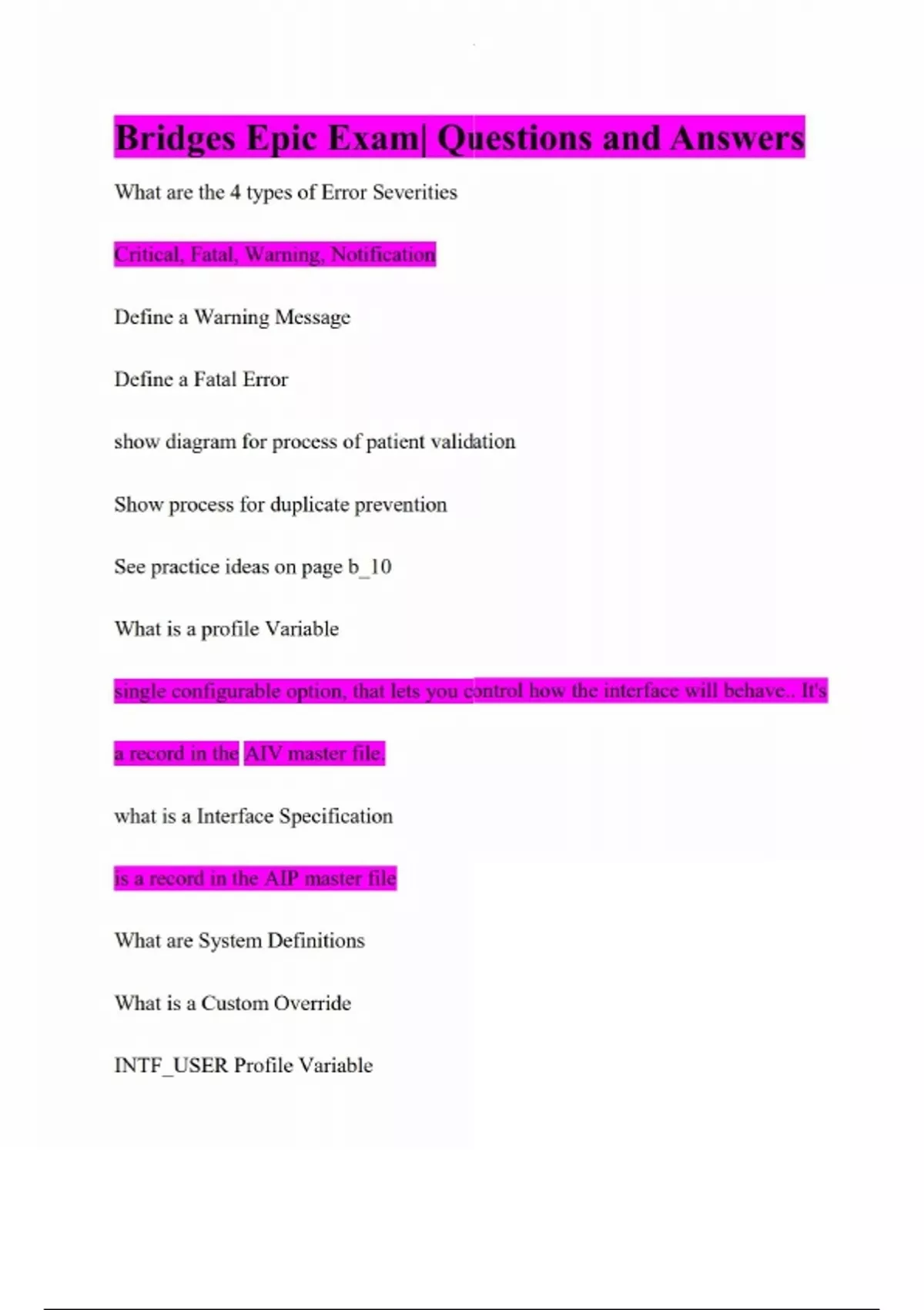Bridges Epic Exam| Questions and Answers What are the 4 types of Error Severities Critical, Fatal, Warning, Notification Define a Warning Message Define a Fatal Error show diagram for process of patient validation Show process for duplicate prevention See practice ideas on page b_10 What is a profile Variable single configurable option, that lets you control how the interface will behave.. It's a record in the AIV master file. what is a Interface Specification is a record in the AIP master file What are System Definitions What is a Custom Override INTF_USER Profile Variable this is required variable for every interface in order for the interface to process messages. An Interface will NOT start without INTF_USER. If this is missing a Bridges error will be generated. explain diff between default and recommended profile variable setting default value is value that appears when you first add the profile, recommended is Epic's value they think you should use. how does the automated purge process determine the number of days to purge messages for a given interface. Interface specification>background monitor>30 day system default. Messages live