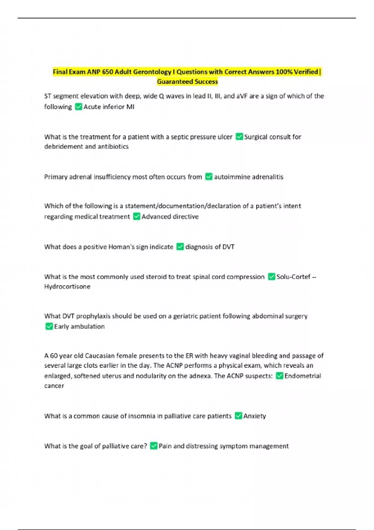 Final Exam ANP 650 Adult Gerontology I Questions with Correct Answers 100% Verified| Guaranteed Success