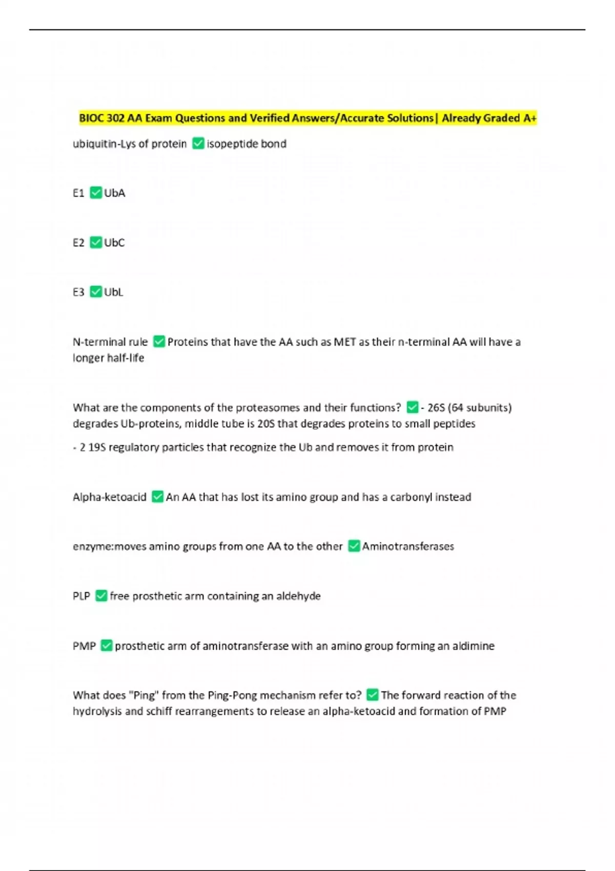 bioc 302 aa exam questions and verified answersac