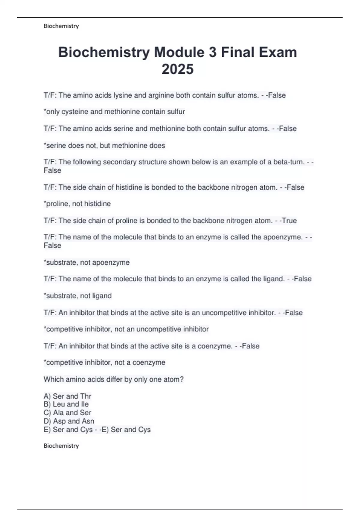 T/F: The amino acids lysine and arginine both contain sulfur atoms. - -False *only cysteine and methionine contain sulfur T/F: The amino acids serine and methionine both contain sulfur atoms. - -False *serine does not, but methionine does T/F: The following secondary structure shown below is an example of a beta-turn. - False T/F: The side chain of histidine is bonded to the backbone nitrogen atom. - -False *proline, not histidine T/F: The side chain of proline is bonded to the backbone nitrogen atom. - -True T/F: The name of the molecule that binds to an enzyme is called the apoenzyme. - False *substrate, not apoenzyme T/F: The name of the molecule that binds to an enzyme is called the ligand. - -False *substrate, not ligand T/F: An inhibitor that binds at the active site is an uncompetitive inhibitor. - -False *competitive inhibitor, not an uncompetitive inhibitor T/F: An inhibitor that binds at the active site is a coenzyme. - -False *competitive inhibitor, not a coenzyme Which amino acids differ by only one atom? A) Ser and Thr B) Leu and Ile C) Ala and Ser D) Asp and Asn E) Ser and Cys - -E) Ser and Cys Biochemistry Biochemistry *serine has an -OH group where cysteine has an -SH group Which amino acids both have an R group (side chain) with an -OH functional group? A) Ser and Thr B) Leu and Ile C) Ala and Ser D) Asp and Asn E) Ser and Cys - -A) Ser and Thr The formation of a peptide bond between two amino acids is an example of a(n) ______________ reaction. A) Cleavage B) Condensation C) Group transfer D) Isomerization E) Oxidation reduction - -B) Condensation The peptide Ala-Glu-Gly-Ala-Leu has ___. A) A disulfide bond B) 5 peptide bonds C) 4 peptide bonds D) A proline residue E) No C-terminal - -C) 4 peptide bonds Formally, when there are 100 or more amino acids that are covalently linked together, it is called a ___. A) Polypeptide B) Oligopeptide C) Peptide D) Protein E) Polyprotein - -D) Protein *protein = 100-200 amino acids oligopeptide = 2-20 amino acids polypeptide = 99 amino acids peptide = no limit What unit is used by biochemists to indicate the mass of a protein? A) g/mol B) Da Biochemistry Biochemistry C) Ba D) Mol/g E) g - -B) Da All of the 20 standard amino acids contain an R-group that is attached to the: A) α carbon B) Carboxyl group C) Amino group D) β carbon E) None of the above - -A) α carbon Which of the following correctly matches the amino acid with its one letter abbreviation? A) Tyrosine, T B) Lysine, L C) Phenylalanine, P D) Aspartic acid, D E) Proline, R - -D) Aspartic acid, D Which of the following correctly matches the amino acid with its one letter abbreviation? A) Tyrosine, T B) Glutamic acid, E C) Phenylalanine, P D) Aspartic acid, A E) Proline, R - -B) Glutamic acid, E By convention, polypeptides are read in which order? A) N to C-terminus B) C to N-terminus C) 5' to 3' D) 3' to 5' E) Smallest to largest amino acid by weight - -A) N to C-terminus Roughly how amino acids are there in one turn of an alpha helix? A) 1 B) 2.8 C) 3.6 D) 4.2 E) 10 - -C) 3.6 In an alpha helix, the R groups on the amino acid residues: Biochemistry Biochemistry A) Alternate between the outside and inside of the helix B) Are found on the outside of the helix spiral C) Cause only right-handed helices to form D) Generate the hydrogen bonds that form the helix E) Stack within the interior of the helix - -B) Are found on the outside of the helix spiral Motifs are classified primarily by their ___. A) Amino acid sequence B) Evolutionary relationships C) Function D) Secondary structure content and arrangement E) Subunit content and arrangement - -D) Secondary structure content and arrangement The secondary structure show below is an example of a(n): - -antiparallel beta sheet The overall three-dimensional shape of a single-folded polypeptide is ___ structure. A) secondary B) tertiary C) quaternary D) quasi E) motif - -B) tertiary How many classes of enzymes are recognized by the IUBMB? A) 3 B) 4 C) 5 D) 6 E) 7 - -D) 6 An enzyme requires Cr3+ for catalysis. When the enzyme contains the Cr3+ is called: A) holoenzyme B) apoenzyme C) fully ready molecule D) inhibitor E) competitive inhibitor - -A) holoenzyme *enzyme without cofactor = apoenzyme, enzyme with cofactor = holoenzyme When a substrate has just started its conversion to a new molecule, it is said to be in the ___. Biochemistry Biochemistry Biochemistry A) stable mode B) unstable mode C) transition state D) conversion state E) conversion mode - -C) transition state Which of the following would change the rate of an enzyme-catalyzed reaction? A) amino acids, concentration, and temperature B) pH, concentration, and temperature C) pH, polarity, and concentration D) polarity, concentration, and temperature E) pH, polarity, and temperature - -B) pH, concentration, and temperature Which of the following described induced fit? A) When a substrate bind to an enzyme, the enzyme induces loss o