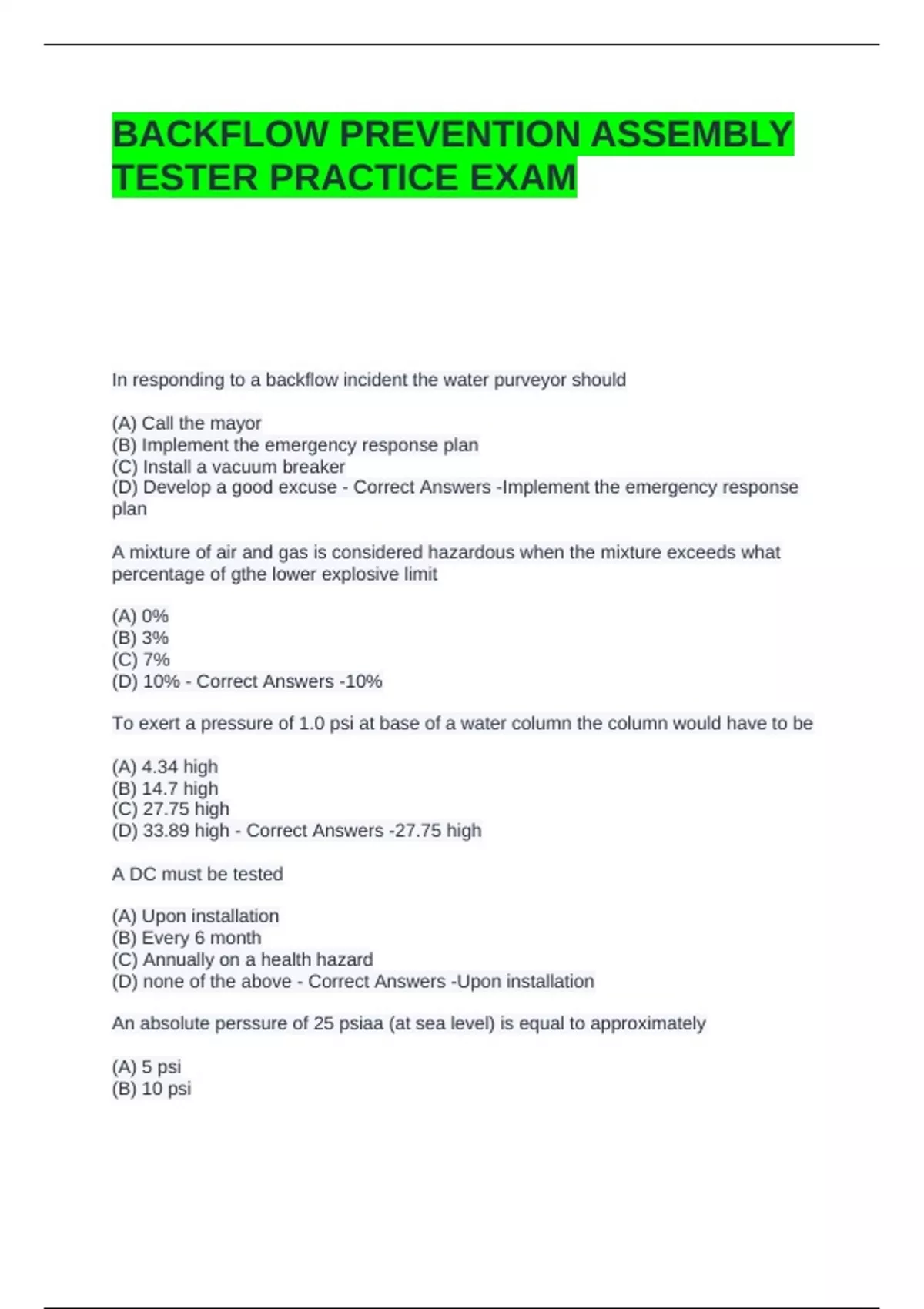 BACKFLOW PREVENTION ASSEMBLY TESTER PRACTICE EXAM WITH ACCURATE SOLUTIONS