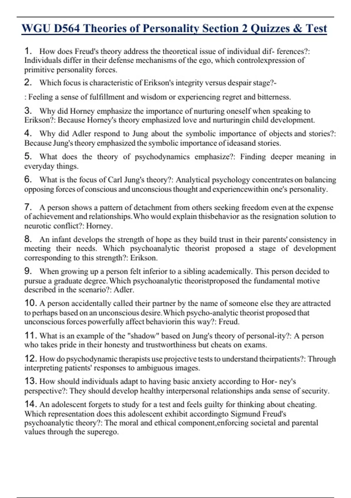 WGU D564 Theories of Personality Section 2 Quizzes & Test