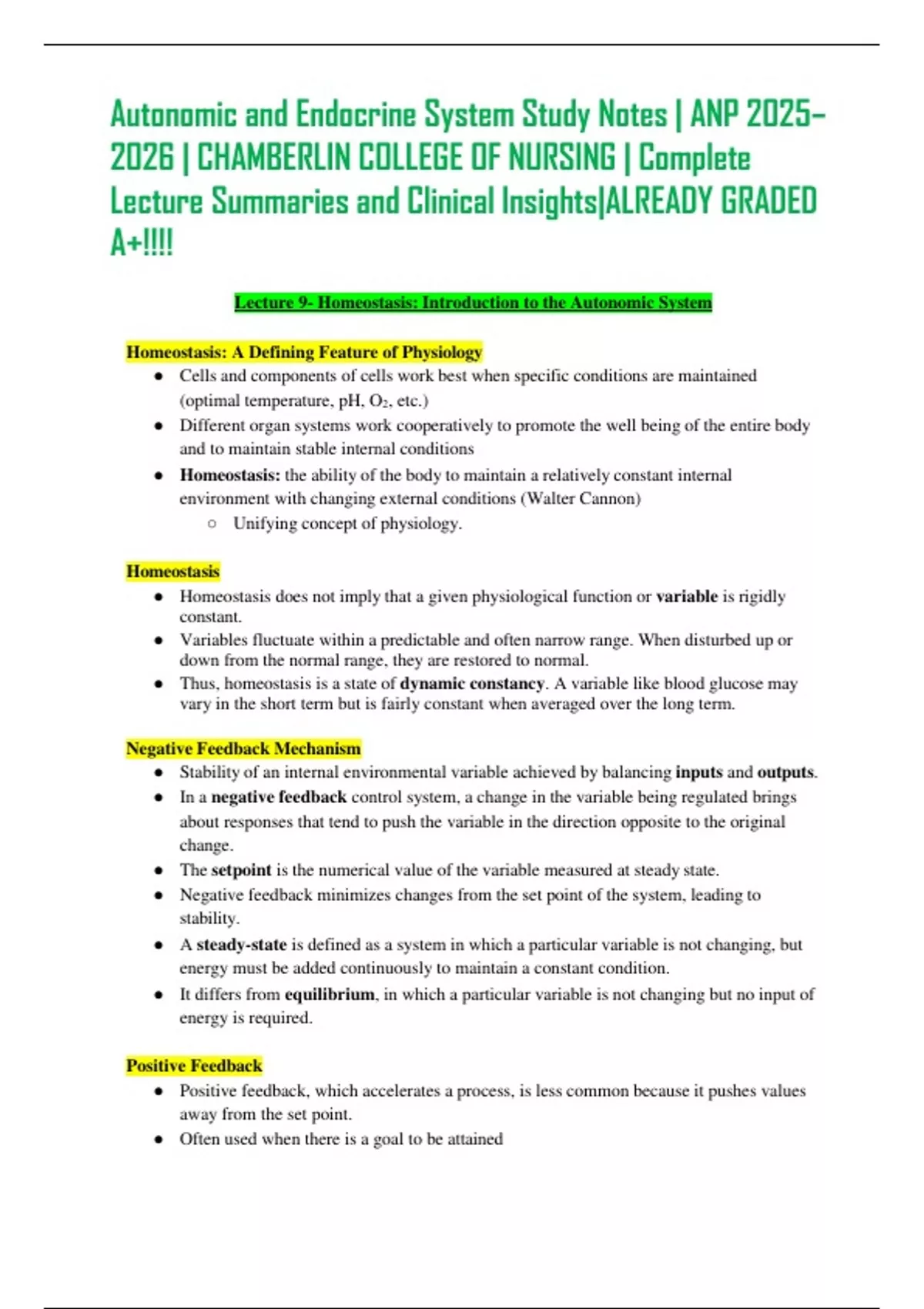 Autonomic and Endocrine System Study Notes | ANP 2025–2026 | CHAMBERLIN COLLEGE OF NURSING | Complete Lecture Summaries and Clinical Insights|ALREADY GRADED A+!!!!