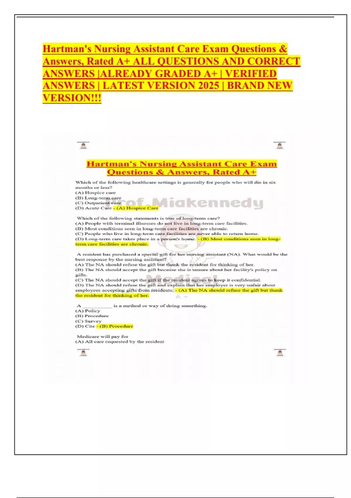 Hartman's Nursing Assistant Care Exam Questions & Answers, Rated A+ ALL QUESTIONS AND CORRECT ANSWERS |ALREADY GRADED A+ | VERIFIED ANSWERS | LATEST VERSION 2025 | BRAND NEW VERSION!!!