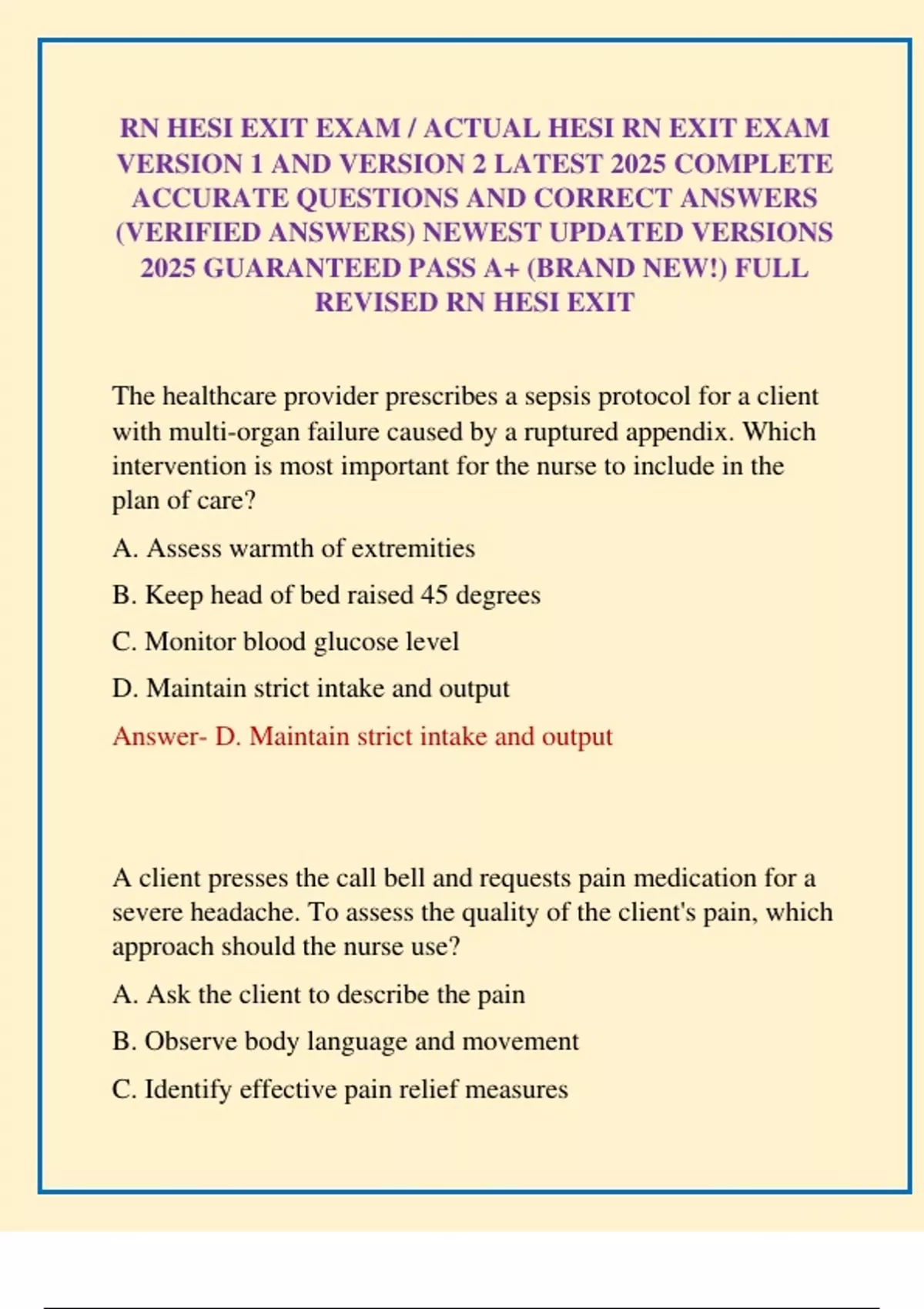 RN HESI EXIT EXAM / ACTUAL HESI RN EXIT EXAM VERSION 1 AND VERSION 2 LATEST 2025 COMPLETE ACCURATE QUESTIONS AND CORRECT ANSWERS (VERIFIED ANSWERS) NEWEST UPDATED VERSIONS 2025 GUARANTEED PASS A+ (BRAND NEW!) FULL REVISED RN HESI EXIT
