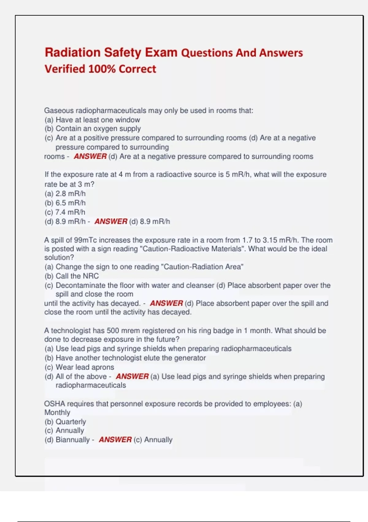 Radiation Safety Exam Questions And Answers Verified 100% Correct Gaseous radiopharmaceuticals may only be used in rooms that: (a) Have at least one window (b) Contain an oxygen supply (c) Are at a positive pressure compared to surrounding rooms (d) Are at a negative pressure compared to surrounding rooms - ANSWER (d) Are at a negative pressure compared to surrounding rooms If the exposure rate at 4 m from a radioactive source is 5 mR/h, what will the exposure rate be at 3 m? (a) 2.8 mR/h (b) 6.5 mR/h (c) 7.4 mR/h (d) 8.9 mR/h - ANSWER (d) 8.9 mR/h A spill of 99mTc increases the exposure rate in a room from 1.7 to 3.15 mR/h. The room is posted with a sign reading "Caution-Radioactive Materials". What would be the ideal solution? (a) Change the sign to one reading "Caution-Radiation Area" (b) Call the NRC (c) Decontaminate the floor with water and cleanser (d) Place absorbent paper over the spill and close the room until the activity has decayed. - ANSWER (d) Place absorbent paper over the spill and close the room until the activity has decayed. A technologist has 500 mrem registered on his ring badge in 1 month. What should be done to decrease exposure in the future? (a) Use lead pigs and syringe shields when preparing radiopharmaceuticals (b) Have another technologist elute the generator (c) Wear lead aprons (d) All of the above - ANSWER (a) Use lead pigs and syringe shields when preparing radiopharmaceuticals OSHA requires that personnel exposure records be provided to employees: (a) Monthly (b) Quarterly (c) Annually (d) Biannually - ANSWER (c) Annually A room containing a 57Co sheet source is posted with a sign reading "CautionRadioactive Materials". The exposure rate measured next to the source is 5.2 mR/h. What should be done? (a) Change the sign to one reading " Caution-Radiation Area" (b) Store the source in a leaded container (c) Monitor the length of time a technologist can work near the source (d) None of the above - ANSWER (b) Store the source in a leaded container A technologist discovers that a patient in the room next to a radioiodine therapy will receive 2.5 mrem/h when lying in his bed which is against the shared wall. What should be done? (a) Move the bed to the other side of the room (b) Discharge the therapy patient (c) Discharge the non-therapy patient (d) Calculate how long visitors to the non-therapy patient can stay (e) Calculate how long the patient may stay in bed each hour - ANSWER (a) Move the bed to the other side of the room What is the dose rate limit at the surface of a package bear- ing a DOT Class I White label? (a) 0.5 mR/h (b) 2 mR/h (c) 50 mR/h (d) 100 mR/h (e) 200 mR/h - ANSWER (a) 0.5 mR/h A Type A package bears a DOT Class II Yellow Radioactive label, has a transport index of 0.8, and contains 10 mCi of 111In oxine. What is the exposure rate at 3 ft from the package? (a) 0.4 mR/h (b) 0.8 mR/h (c) 1.0 mR/h (d) 7 mR/h (e) Cannot be determined from the information given - ANSWER (b) 0.8 mR/h The doorway to the Nuclear Medicine reception area should be posted with: (a) Caution: Radiation Area (b) Caution: High Radiation Area (c) Grave Danger: Very High Radiation Area (d) Caution: Radioactive Materials (e) None of the above - ANSWER (e) None of the above Which of the following steps would not decrease a technol- ogist's chances of internal exposure to radiation?