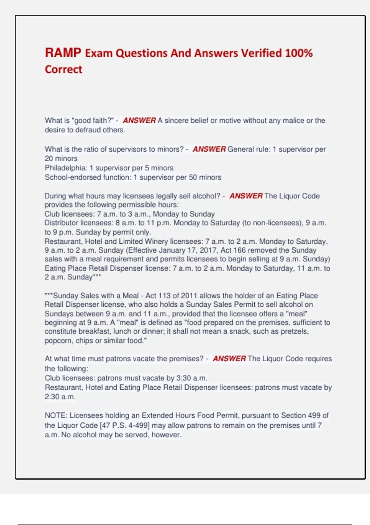 RAMP Exam Questions And Answers Verified 100% Correct What is "good faith?" - ANSWER A sincere belief or motive without any malice or the desire to defraud others. What is the ratio of supervisors to minors? - ANSWER General rule: 1 supervisor per 20 minors Philadelphia: 1 supervisor per 5 minors School-endorsed function: 1 supervisor per 50 minors During what hours may licensees legally sell alcohol? - ANSWER The Liquor Code provides the following permissible hours: Club licensees: 7 a.m. to 3 a.m., Monday to Sunday Distributor licensees: 8 a.m. to 11 p.m. Monday to Saturday (to non-licensees), 9 a.m. to 9 p.m. Sunday by permit only. Restaurant, Hotel and Limited Winery licensees: 7 a.m. to 2 a.m. Monday to Saturday, 9 a.m. to 2 a.m. Sunday (Effective January 17, 2017, Act 166 removed the Sunday sales with a meal requirement and permits licensees to begin selling at 9 a.m. Sunday) Eating Place Retail Dispenser license: 7 a.m. to 2 a.m. Monday to Saturday, 11 a.m. to 2 a.m. Sunday*** ***Sunday Sales with a Meal - Act 113 of 2011 allows the holder of an Eating Place Retail Dispenser license, who also holds a Sunday Sales Permit to sell alcohol on Sundays between 9 a.m. and 11 a.m., provided that the licensee offers a "meal" beginning at 9 a.m. A "meal" is defined as "food prepared on the premises, sufficient to constitute breakfast, lunch or dinner; it shall not mean a snack, such as pretzels, popcorn, chips or similar food." At what time must patrons vacate the premises? - ANSWER The Liquor Code requires the following: Club licensees: patrons must vacate by 3:30 a.m. Restaurant, Hotel and Eating Place Retail Dispenser licensees: patrons must vacate by 2:30 a.m. NOTE: Licensees holding an Extended Hours Food Permit, pursuant to Section 499 of the Liquor Code [47 P.S. 4-499] may allow patrons to remain on the premises until 7 a.m. No alcohol may be served, however. NOTE: Employees may remain on the premises after the legal closing hour only if the employees are actively working. Once an employee finishes working, he/she must vacate. May a minor sit at the bar? - ANSWER Yes. There is nothing in the Liquor Code or PLCB regulations limiting where a minor may go on the licensed premises, as long as they are on the licensed premises legally with a parent, legal guardian or a proper supervisor. If a Restaurant, Hotel, or Retail Dispenser licensed premises has gross sales of food and non-alcoholic beverages equal to 50 percent or more of its combined gross sales of both food and alcoholic beverages, then minors are permitted on the premises. The presence of a parent, legal guardian, or proper supervisor is not necessary, but minors present under the "Pizza Hut Exception" are not permitted to sit in the bar section of the premises. A licensee may implement a house policy prohibiting minors from sitting at the bar. How many drinks may you serve to a person at one time for on-premises consumption? - ANSWER There is nothing in the Liquor Code or PLCB regulations limiting the number of drinks that may be sold to one person at one time. However, because a licensee may not sell, furnish or give or permit to be sold, furnished or given alcohol to a visibly intoxicated person, licensees should use care in selling more than one drink to one patron. May licensees refill smaller bottles of liquor with the same product/brand from a larger bottle? - ANSWER No. The Liquor Code prohibits the refilling of any liquor bottle or container with any liquid whatsoever. How many ounces of beer may be sold "to go" in one transaction? - ANSWER The Liquor Code provides that a Restaurant, Hotel or Eating Place Retail Dispenser licensee may sell up to 192 fluid ounces in a single sale. Patrons may pay for 192 fluid ounces and may thereafter return to purchase additional quantities as long as each purchase is a separate transaction. May a club sell beer "to go?" - ANSWER No. The Liquor Code prohibits a club from selling alcohol for off-premises consumption. May a patron leave a restaurant with a partially consumed bottle of wine? - ANSWER Yes. The Liquor Code permits a patron to leave with a partially consumed bottle of wine, providing it was purchased in conjunction with a meal. However, the bottle must be resealed. It should also be noted that, outside of the Liquor Code and the PLCB regulations, there are two (2) types of open container laws that may be implicated when removing a partially-consumed bottle of wine from a licensed premises. One (1) type involves local ordinances that are passed by some municipalities in an attempt to regulate the carrying of open containers of alcohol within that municipality. Local ordinances vary in their language and scope. The other type of open container law is a state law found in the Pennsylvania Vehicle Code, formerly found in the Pennsylvania Crimes Code, that makes it unlawful for people in motor vehicles to possess an open alcoholic beverage container or to consume such while the vehicle is on a highway. [75 Pa. C.S. § 3809]. How long may a licensee's happy hour be? - ANSWER Licensees may hold happy hours up to four (4) hours per day but no more than fourteen (14) hours per week. The hours need not be consecutive. Notice of all happy hours must be posted on the licensed premises seven (7) days in advance. May a licensee have a happy hour after midnight? - ANSWER No. All happy hours must end before midnight. May a licensee run a daily drink special until 2 a.m.? - ANSWER No. Daily specials must end before midnight. May a licensee discount all draft beer as a daily special? - ANSWER No. A retail licensee is permitted to offer one (1) specific type of alcoholic beverage at a discounted price all day or for a portion of the day, if he/she chooses. [40 Pa. Code § 13.102(b)(2)]. A specific type of alcoholic beverage means either a specific registered brand of malt or brewed beverage, a type of wine, a type of distilled spirits or a mixed drink. [Id.]. As a daily drink special, a speci