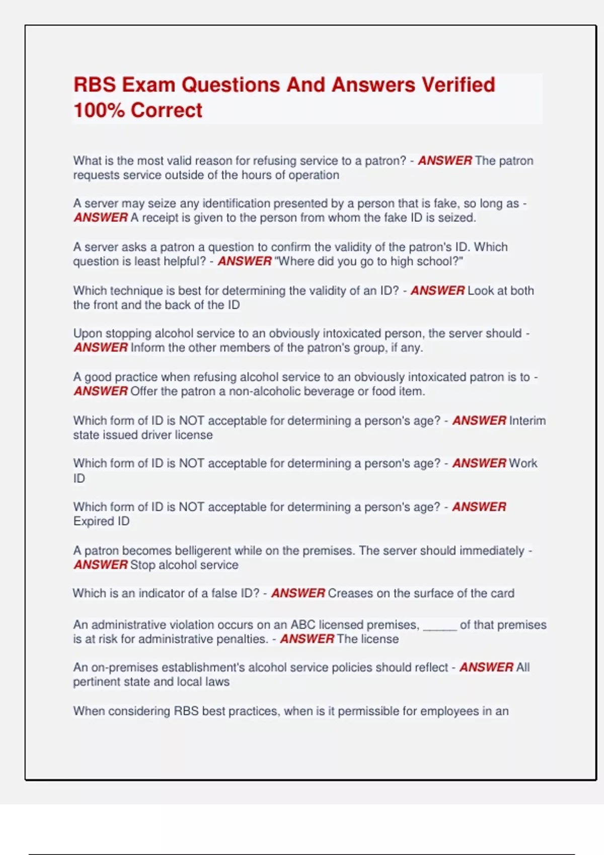 RBS Exam Questions And Answers Verified 100% Correct What is the most valid reason for refusing service to a patron? - ANSWER The patron requests service outside of the hours of operation A server may seize any identification presented by a person that is fake, so long as - ANSWER A receipt is given to the person from whom the fake ID is seized. A server asks a patron a question to confirm the validity of the patron's ID. Which question is least helpful? - ANSWER "Where did you go to high school?" Which technique is best for determining the validity of an ID? - ANSWER Look at both the front and the back of the ID Upon stopping alcohol service to an obviously intoxicated person, the server should - ANSWER Inform the other members of the patron's group, if any. A good practice when refusing alcohol service to an obviously intoxicated patron is to - ANSWER Offer the patron a non-alcoholic beverage or food item. Which form of ID is NOT acceptable for determining a person's age? - ANSWER Interim state issued driver license Which form of ID is NOT acceptable for determining a person's age? - ANSWER Work ID Which form of ID is NOT acceptable for determining a person's age? - ANSWER Expired ID A patron becomes belligerent while on the premises. The server should immediately - ANSWER Stop alcohol service Which is an indicator of a false ID? - ANSWER Creases on the surface of the card An administrative violation occurs on an ABC licensed premises, _____ of that premises is at risk for administrative penalties. - ANSWER The license An on-premises establishment's alcohol service policies should reflect - ANSWER All pertinent state and local laws When considering RBS best practices, when is it permissible for employees in an alcohol establishment to consume alcohol while working? - ANSWER Alcohol consumption by workers should be discouraged Which promotion is considered discriminatory? - ANSWER Ladies' drinks are half off Which is considered a good hospitality practice when serving alcoholic beverages? - ANSWER Offering to serve a glass of water with an alcoholic beverage What is the minimum age an employee must be to pour an alcoholic beverage? - ANSWER 21 Frequent calls for service to local law enforcement by an on-premises licensee may result in - ANSWER Suspension of alcohol license Which drink typically contains multiple types of alcohol? - ANSWER Martini As a server or bartender, it is a good practice - ANSWER To have multiple interactions with patrons to evaluate their moods and needs. What information should be documented in an incident log? - ANSWER names and addresses of all patrons Which term is defined as drinking a lot of alcohol in a short time period? - ANSWER Binge drinking Which neighborhood quality of life issue is most affected by the overuse of alcohol? - ANSWER Crime Which condition is associated with alcohol-impaired driving? - ANSWER Reduced concentration When alcohol is mixed with ______ the side effects can range from discomfort to death. - ANSWER Medications or recreational drugs What is the best way to sober up an intoxicated person? - ANSWER Only time will sober up an intoxicated person What does "BAC" mean? - ANSWER Blood alcohol concentration Which statement is true regarding people with a high tolerance to alcohol? - ANSWER They are better at hiding their intoxication Which type of food works best to slow the speed at which alcohol is absorbed by the body? - ANSWER Fatty foods The use of foul language is an example of - ANSWER The lowering of inhibitions Which statement about alcohol's path through the human body is true? - ANSWER No digestion is needed in alcohol absorption What is the primary purpose of ABC's T.R.A.C.E. program? - ANSWER Identify and investigate where persons under 21 years of age obtained alcohol and who was killed or obtained serious injury or accident It is unlawful for a person who has _____ percent or more, by weight, of alcohol in his/her blood to drive a vehicle. - ANSWER 0.08 When can a 19-year old legally serve alcoholic beverages in a restaurant? - ANSWER When the server's primary responsibilities is to serve food Who has the right to visit and inspect any establishment that sells alcoholic beverages? - ANSWER ABC and local law enforcement What is the duty of the designated RBS certified person at a non-profit organization's temporary alcohol event? - ANSWER To remain onsite for the duration of the event An alcohol server must complete an ABC approved RBS training program and pass an ABC administered exam within ____ calendar days of employment. - ANSWER 60 Security personnel, whose post is located outside the entrance to an alcohol establishment, has the primary responsibility to control the number of patrons entering and to check their IDs. Does the bouncer need to be certified? - ANSWER Yes, because security personnel check IDs. Infractions are punishable by - ANSWER A fine What does "RBS" mean? - ANSWER Responsible Beverage Service Alcoholic beverages that contain _____ products are prohibited. - ANSWER Cannabis A member of a group of patrons becomes obviously intoxicated. What should the server do? - ANSWER Inform the other group members that the obviously intoxicated patron will no longer be served alcohol. A legally acceptable ID has which characteristic? - ANSWER Valid expiration date The photo on a California issued ID appears to be altered. Is the ID still valid to determine the patron's age? - ANSWER No, the ID is invalid.