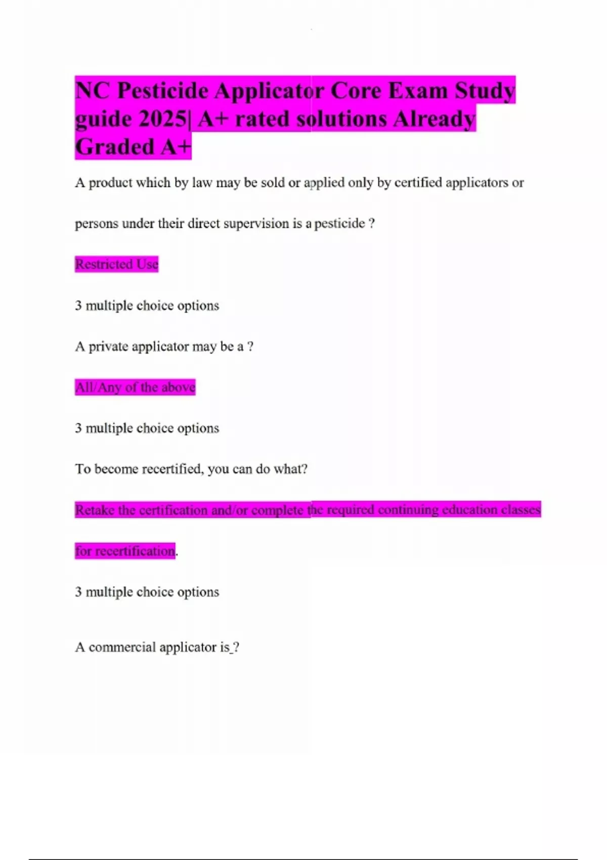 NC Pesticide Applicator Core Exam Study guide 2025| A+ rated solutions Already Graded A+ A product which by law may be sold or applied only by certified applicators or persons under their direct supervision is a pesticide ? Restricted Use 3 multiple choice options A private applicator may be a ? All/Any of the above 3 multiple choice options To become recertified, you can do what? Retake the certification and/or complete the required continuing education classes for recertification. 3 multiple choice options A commercial applicator is ?Anyone who uses or supervises the use of any pesticide on someone else's property for compensation and is required to be licensed with the NCDA&CS 3 multiple choice options What does NCDA&CS stand for? North Carolina Department of Agriculture and Consumer Services 3 multiple choice options Which describes "General-Use" pesticides? Pesticides that have less potential to cause harm to humans or the environment. 3 multiple choice options Licensed and certified structural pest control applicators have a year certification period? 5 3 multiple choice options To preform pest control services for hire, a certified structural pest control applicator must work for a pest control company?Licensed 3 multiple choice options In accordance with the label and any regulations established by the pesticide board, which animals listed may be controlled with pesticides?