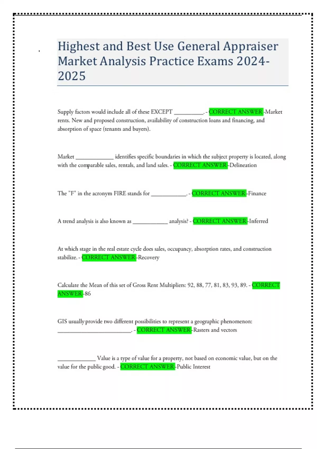 Highest and Best Use General Appraiser Market Analysis Practice Exams 2024- 2025