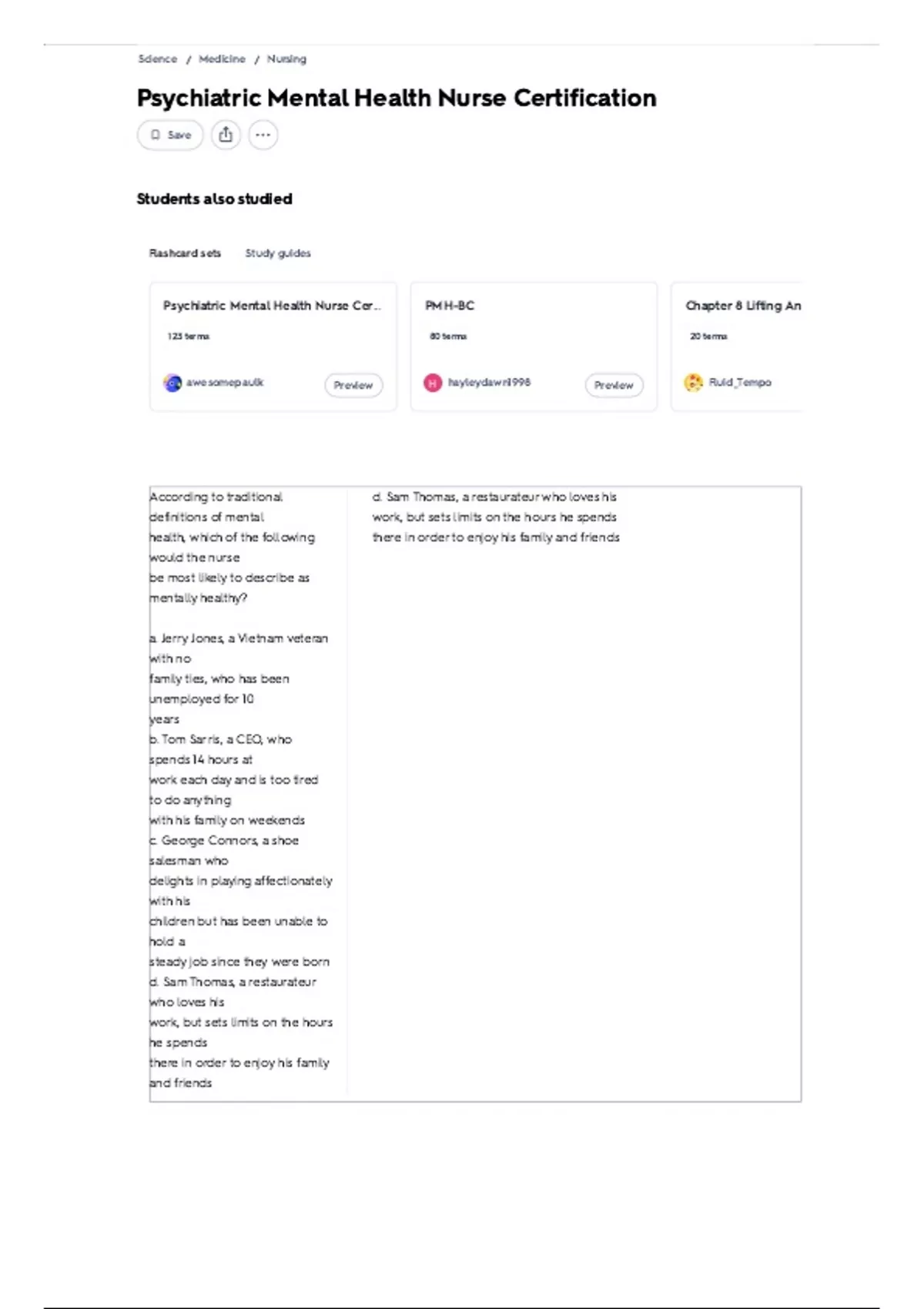 Psychiatric Mental Health Nurse Cer... PMH-BC Chapter 8 Lifting An
