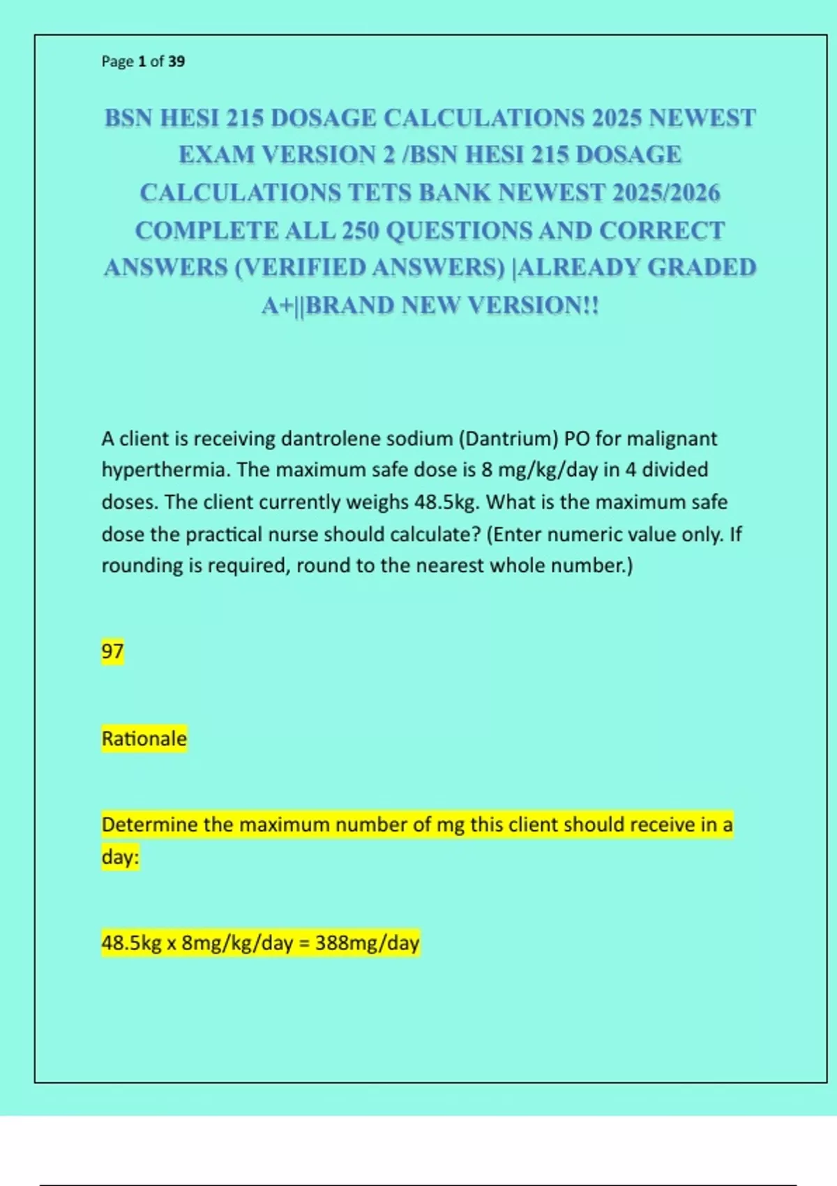 BSN HESI 215 DOSAGE CALCULATIONS 2025 NEWEST EXAM VERSION 2 /BSN HESI 215 DOSAGE CALCULATIONS TETS BANK NEWEST 2025/2026 COMPLETE ALL 250 QUESTIONS AND CORRECT ANSWERS (VERIFIED ANSWERS) |ALREADY GRADED A+||BRAND NEW VERSION!! A client is receiving dantrolene sodium (Dantrium) PO for malignant hyperthermia. The maximum safe dose is 8 mg/kg/day in 4 divided doses. The client currently weighs 48.5kg. What is the maximum safe dose the practical nurse should calculate? (Enter numeric value only. If rounding is required, round to the nearest whole number.) 97 Rationale Determine the maximum number of mg this client should receive in a day: 48.5kg x 8mg/kg/day = 388mg/day Next determine how many mg the nurse should deliver each dose: 388mg/4 doses = 97mg